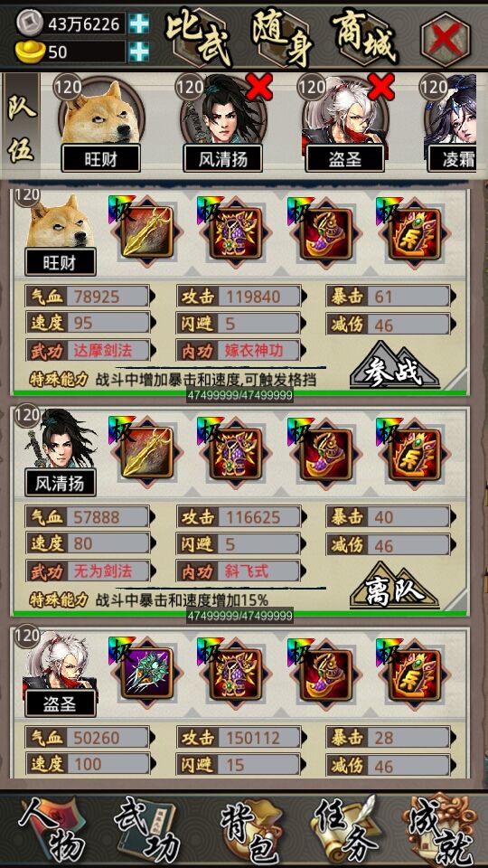 我的旺财有比武换的六级剑法六级内功,其他4个出战伙伴都是五级的,我还肝了焦土,没暴击所以就没装上