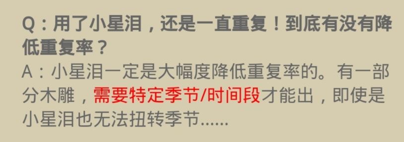 注意,小星泪和晶片一定要在,确定了你所缺的木雕出现的季节中用,不然会浪费。而且我建议在你收集40个木雕以上再用小星泪,我在还剩三个木雕未获得时,用了两个小星泪出了两个新木雕,最后剩下一个稀有木雕是用特定装饰品出的。