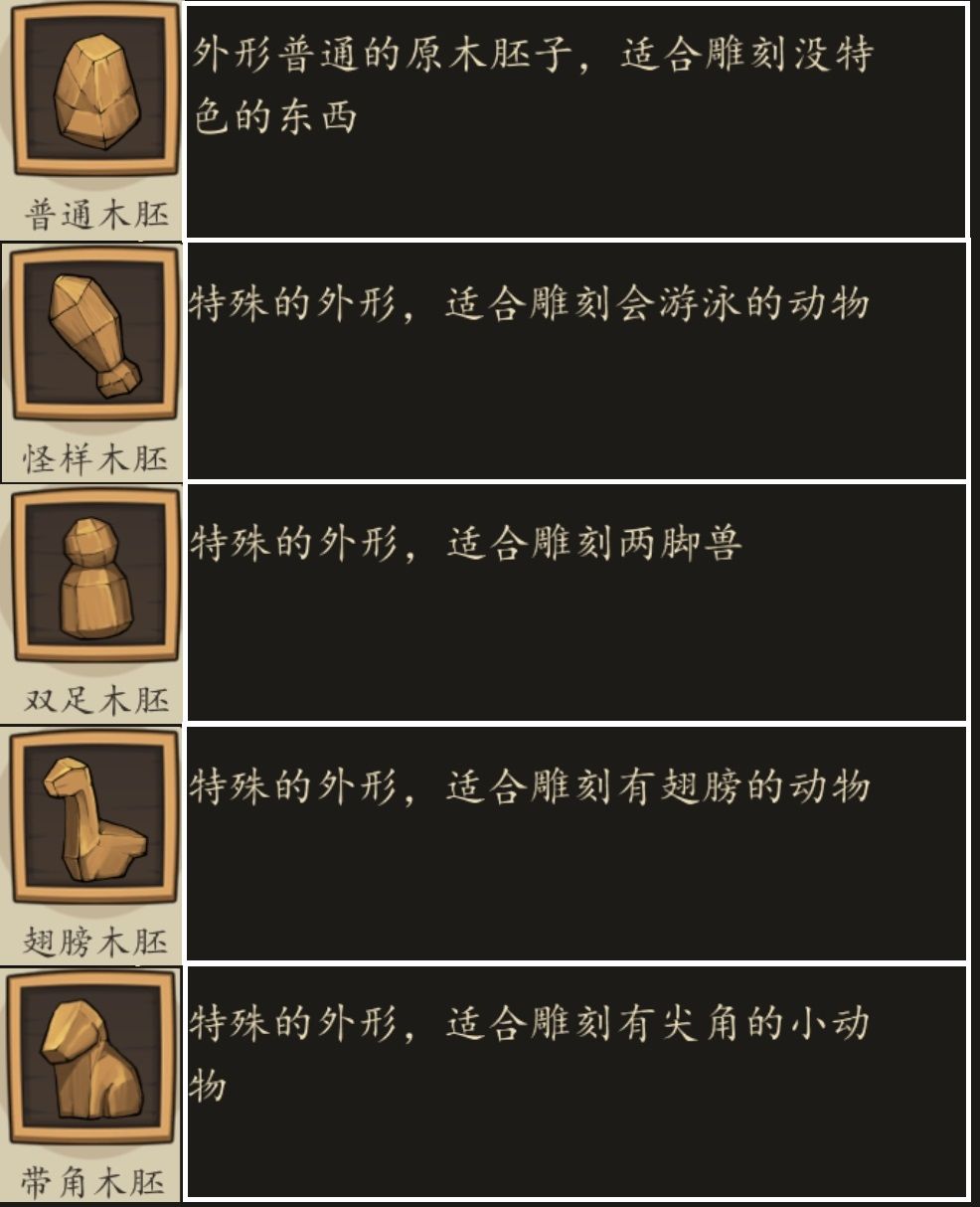 虽然影响不大但是也有联系,这里我介绍一下木胚的规律,有兴趣的玩家可以看一下。没兴趣的玩家可以跳过“关于木胚”这一部分,看下一部分,或者直接去评论区,我已经把每个木雕对应的木胚配方写上了。
