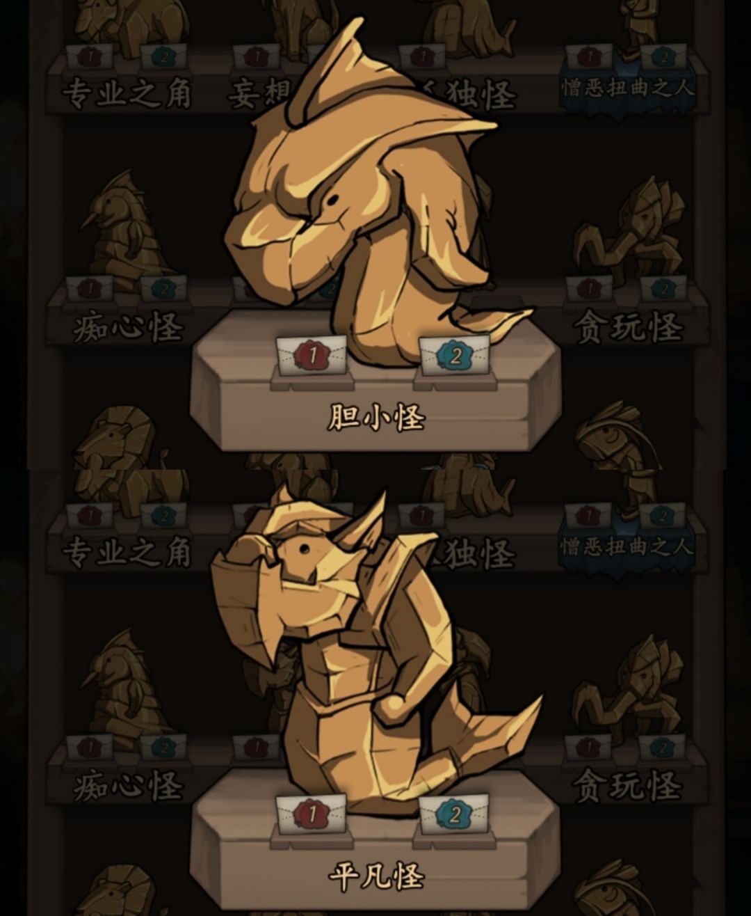 “怪”“兽”木雕通过图鉴选择,长得像鱼,优先用怪状木胚,然后看有没有脚,有脚的用双足木胚。
