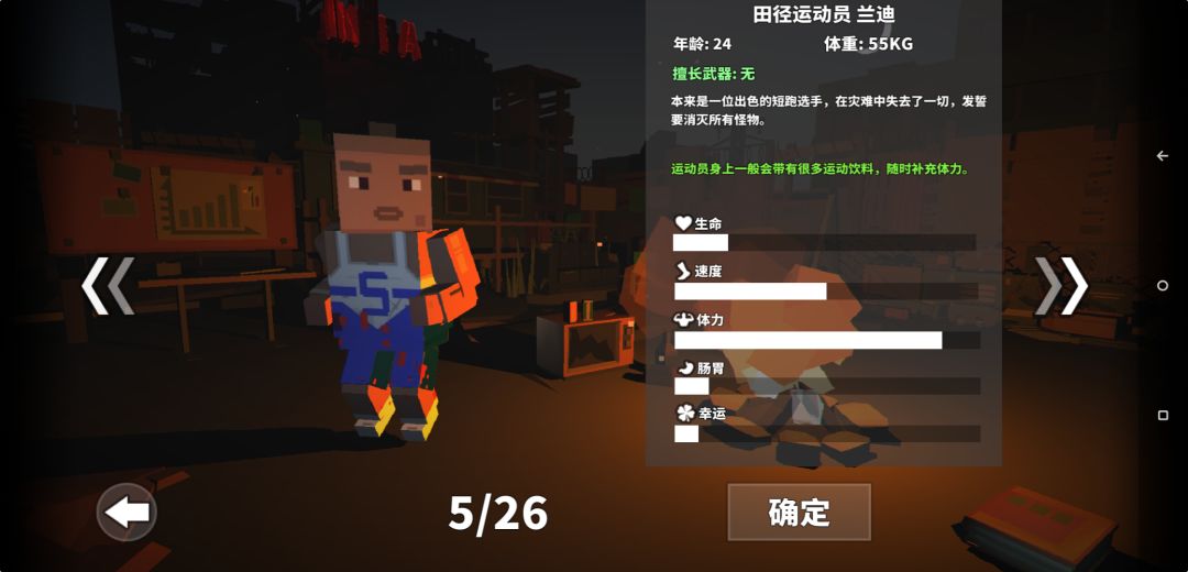 猎人,全方面属性人物,中+速度 中+耐力 高饱食,加上动物伤害加成,比较适合农场地图使用,就是本命武器是弓弩,是把鸡肋武器