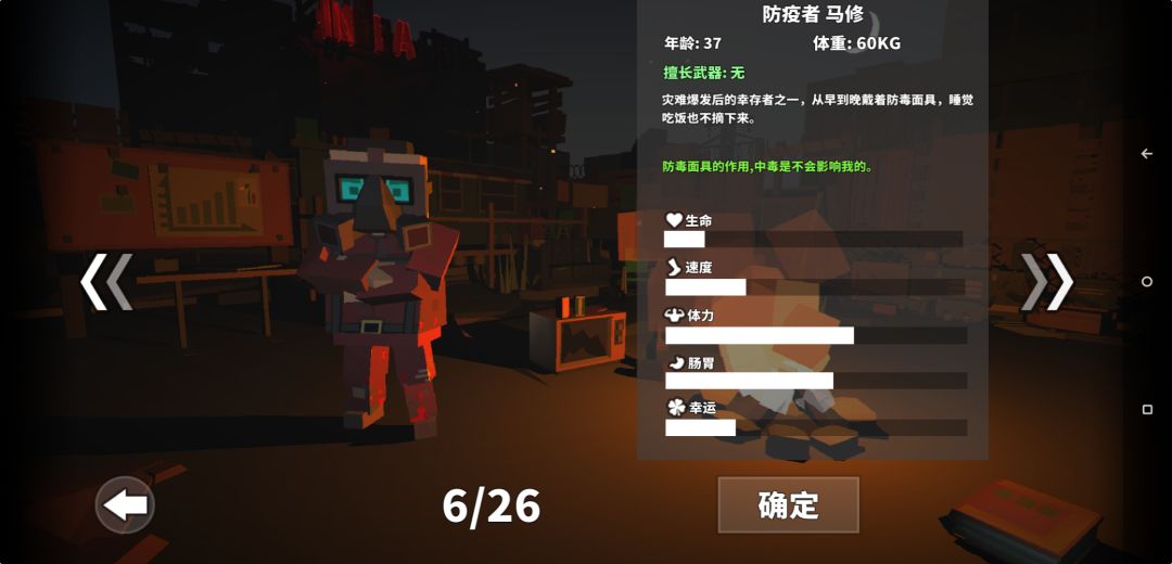 面具哥,比较好的一个角色,体力好且耐饿,速度中等,免收毒buff伤害,但是被毒打到还是会受到一点的攻击伤害,并不是免疫毒怪的全部伤害,总体是比较好的角色