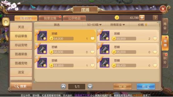 1)、在交易—摆摊处购买装备、宠物、法定、时装、坐骑、技能(人物+宠物)、强化材料、奇珍异宝、烹饪产出道具和炼药产出道具等。