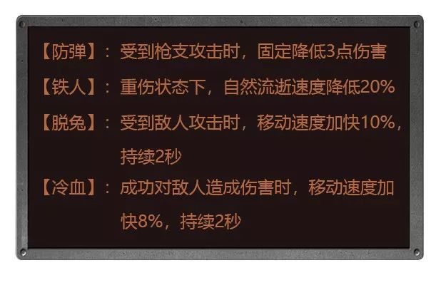 防弹降低受到的伤害,铁人让你扛伤更久,复苏赋能可以回复生命值,浴血奋战伤害更高。