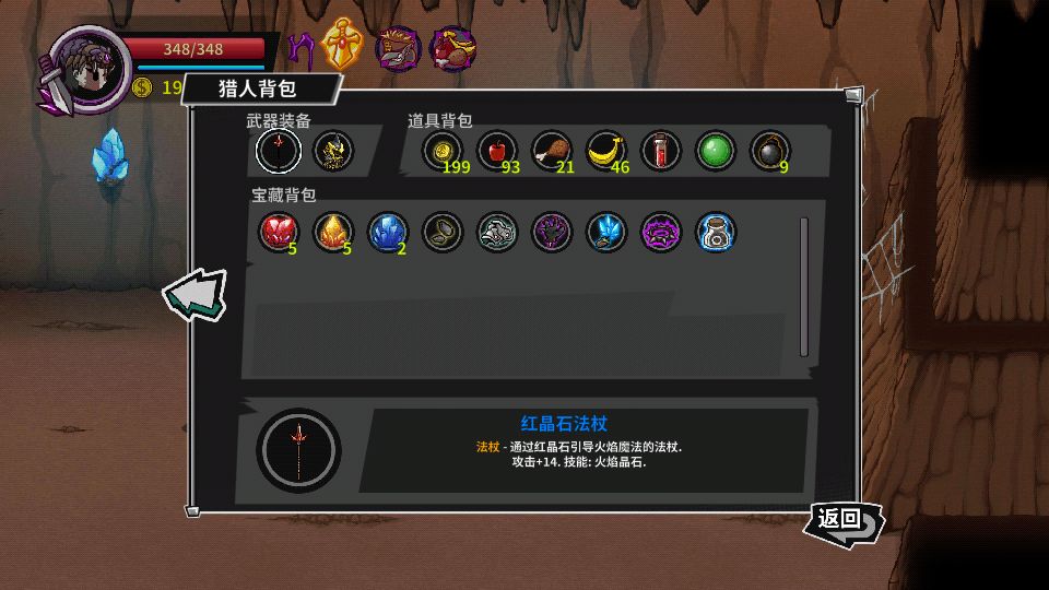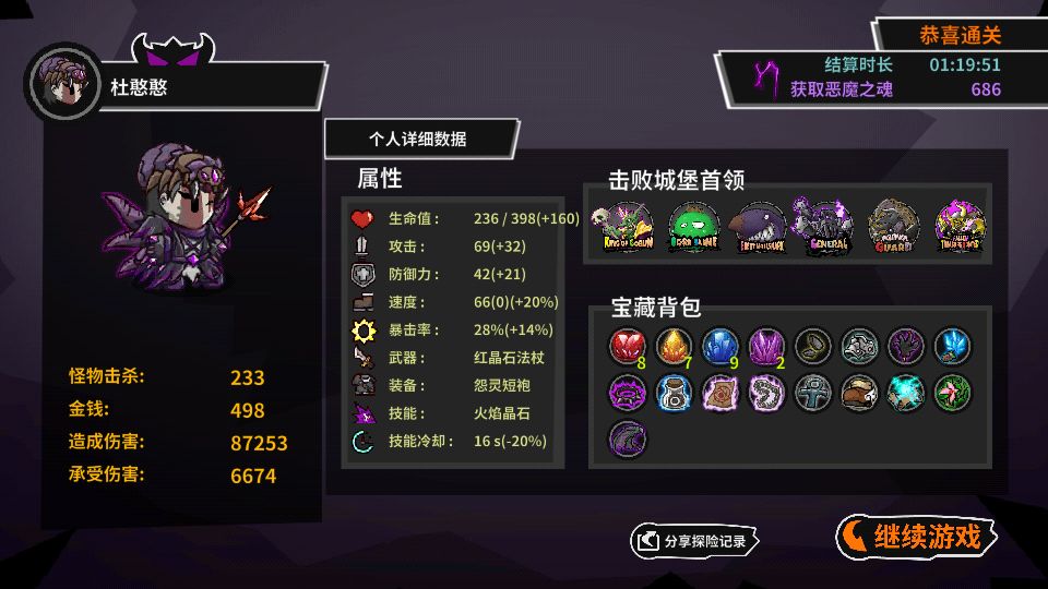 第三关地窟这里找个水晶多的,存档大法,刷掉落物。我就花了十分钟,苹果99+,鸡腿香蕉都是四五十,还能刷金币注意一定要选水晶多的,因为后面打箱子是真的没什么掉落物 后面两个图都是靠走位,放技能,衣服选技能冷却的,十秒一个晶石,boss都是4-5个技能的问题,走位就对了