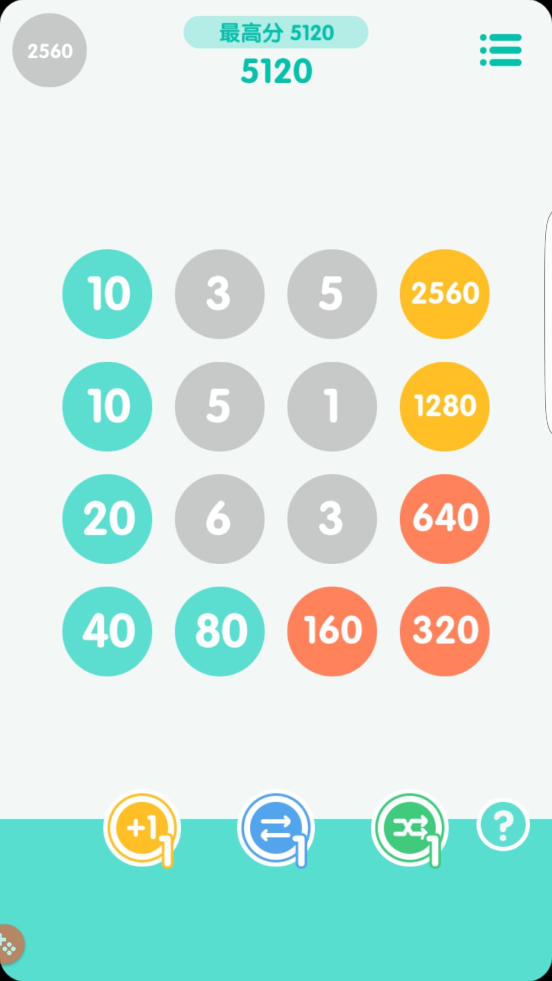 实施方法:将最大的一个放在角落,其余的绕着四壁从大到小排列合成,和2048类似(2048是蛇形排列,这游戏是贴四壁排列合成),在合成时,有意识的把大的数优先合成,为了防止满屏幕5和6。剩下的就是耐心合成。