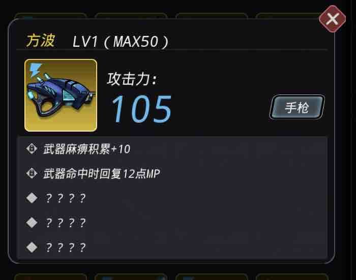 麻痹积累很低的电手枪……回蓝词条目测还挺给力,但是也没有其他属性了,也没减CD也没有加命中,相比竞技场更适合刷图的鸡肋武器……