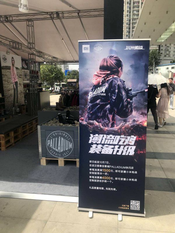 线下部分,《小米枪战》在全国的Palladium门店进行了游戏地推宣传。10月1日-7日期间,凡在全国palladium门店消费,均可获得《小米枪战》游戏礼包一份。