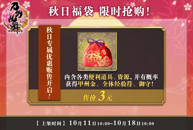 【活动详情】秋日福袋惊喜再临,活动期间在【万屋-特卖】购买秋日3元福袋,必得各类便利道具或资源,有机会开出甲州金、经验符、全体经验符、御札、御守等超值道具。所有内含道具价值均高于或等于福袋售价。