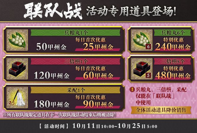 【活动详情】本次万屋将上架所有联队战活动专用道具。在战斗中选择“部队恢复”使用【兵粮丸】,能够补满当前出阵部队中刀剑男士的生存值。在确认出阵前,若审神者选择使用【三倍枡】,则该轮出阵结束后将获得三倍数量的【御岁魂】。使用【采配】则能使已经下场的部队再次出阵。单个道具每日首次购买享有优惠,礼包购买则更有特别优惠。更多道具详情可点击【万屋-特卖】页签查看。注:所有联队战限定道具在下一次联队战活动结束后将被清除。