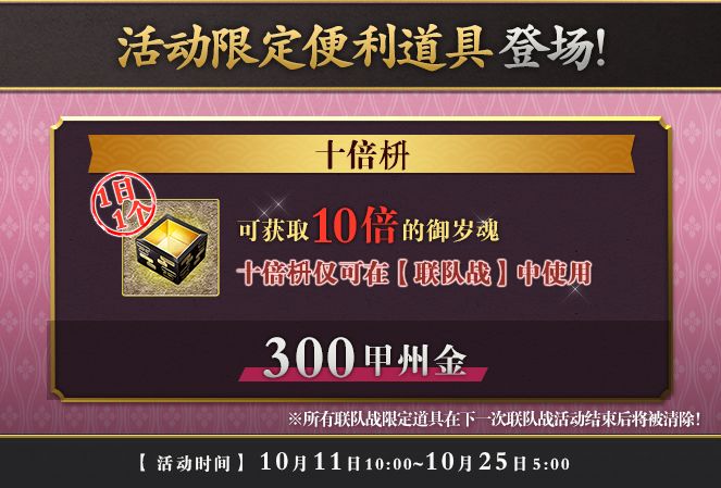【活动详情】活动期间内,万屋将上架联队战全新活动便利道具【十倍枡】。在确认出阵前,若审神者选择使用【十倍枡】,则本轮出阵结束后将获得十倍数量的【御岁魂】。该道具只能在联队战活动中使用。每个【十倍枡】售价300甲州金,每日限量购买1个,请不要错过机会!注:所有联队战限定道具在下一次联队战活动结束后将被清除。