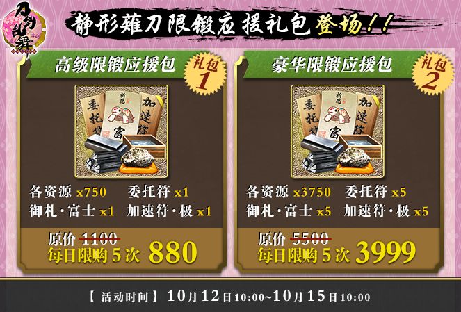 【活动详情】活动期间,两款静形薙刀限锻应援礼包上架。高级限锻应援包内含御札·富士*1,加速符·极*1,委托符*1,各资源*750,原价1100,现价880,每日限购5次。豪华限锻应援包内含御札·富士*5,加速符·极*5,委托符*5,各资源*3750,原价5500,现价3999,每日限购5次。此外,万屋还有两款富士特卖礼包限时销售,全力应援审神者锻造心仪的刀剑男士。