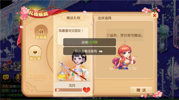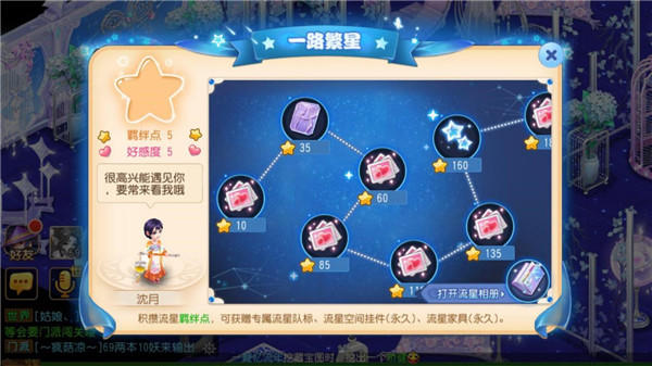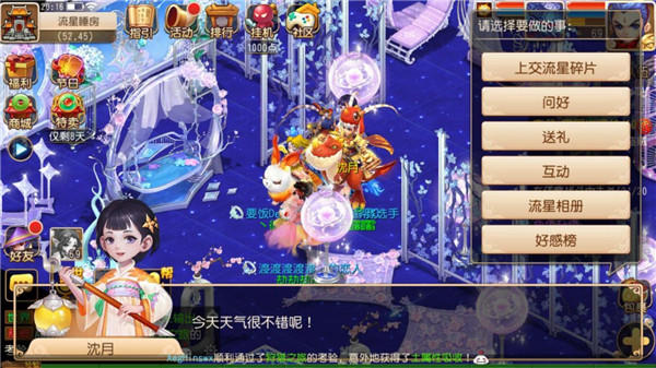 具体来看,玩家日常可通过【上交流星碎片】、【问好】或【送礼】的形式,增加和沈月的好感度。其中:【流星碎片】可通过参与抓鬼、师门、副本和秘境玩法获得,10个流星碎片也可以组成一片星屑,在夜空中划出美丽弧线,触发绚丽的流星之光;【问好送礼】问好即日常与沈月打招呼问候,而送礼则包括“送物品”(三级药和烹饪)和“送心愿”(玫瑰花和金兰花)两种,送心愿时还能够附带你所想要对沈月说的话哦!