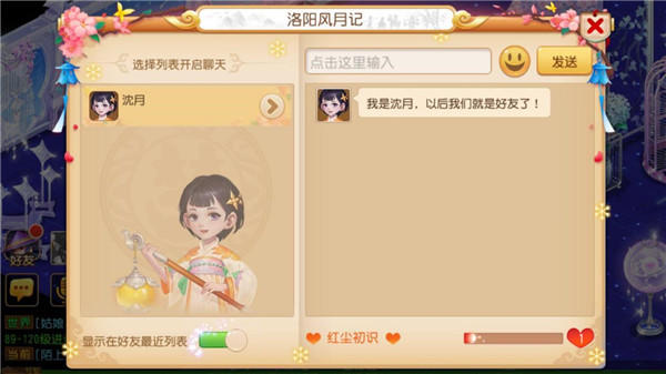 洛阳城中风与月,解君所诺千年约。此番,沈月以游戏内NPC的身份现身洛阳风月记玩法,等级≥35级的玩家,可与沈月结为游戏好友,通过一系列的游戏内互动和交流,解锁沈月亲密语音、照片、公主抱姿势等满满福利,创造自己与沈月之间的专属甜蜜记忆。