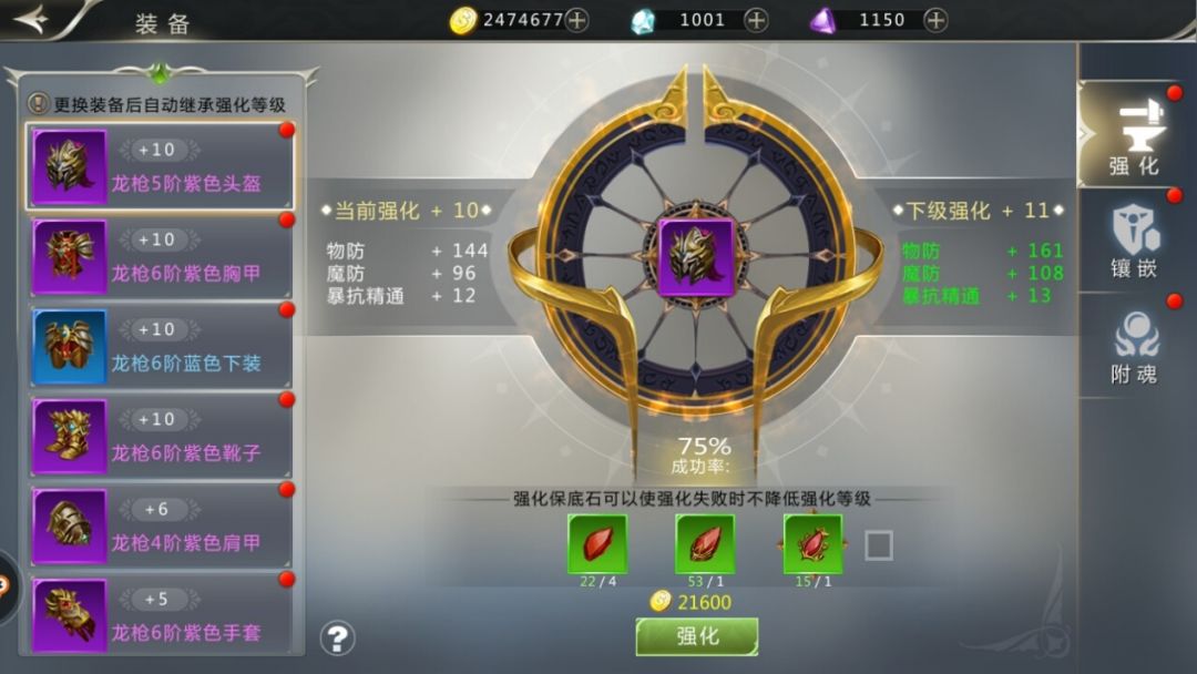 各部位的装备都可以通过强化来提升属性,通过使用强化石和少量的金币即可使装备提升一定的属性。