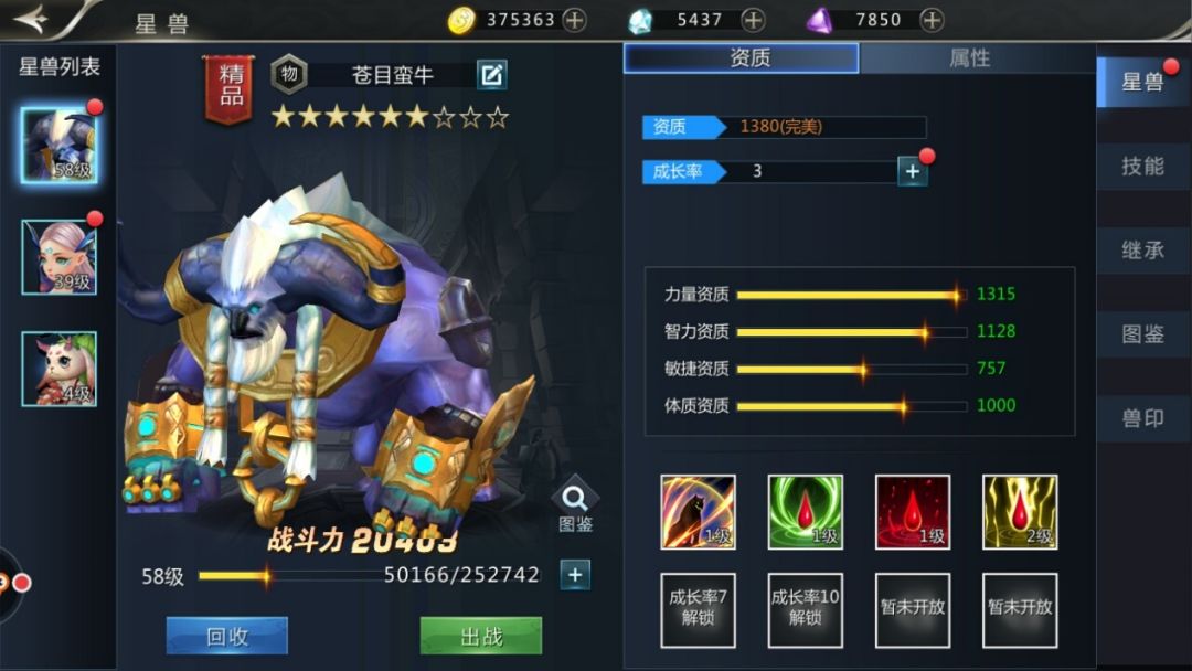 进入天衍兽界面后,可以看到天衍兽界的基本信息,已拥有的天衍兽列表、资质、成长率、技能等,进入属性页面,则会显示天衍兽的具体属性值。