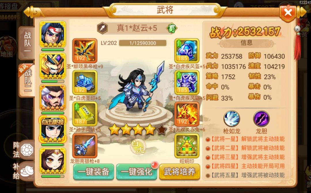 阵容如视频所示,40级白马阵+50%速度,10.3万赵云先手减速,即可全部先手。然后就是邓艾,卞姬,曹操,张辽加功减防一顿操作。