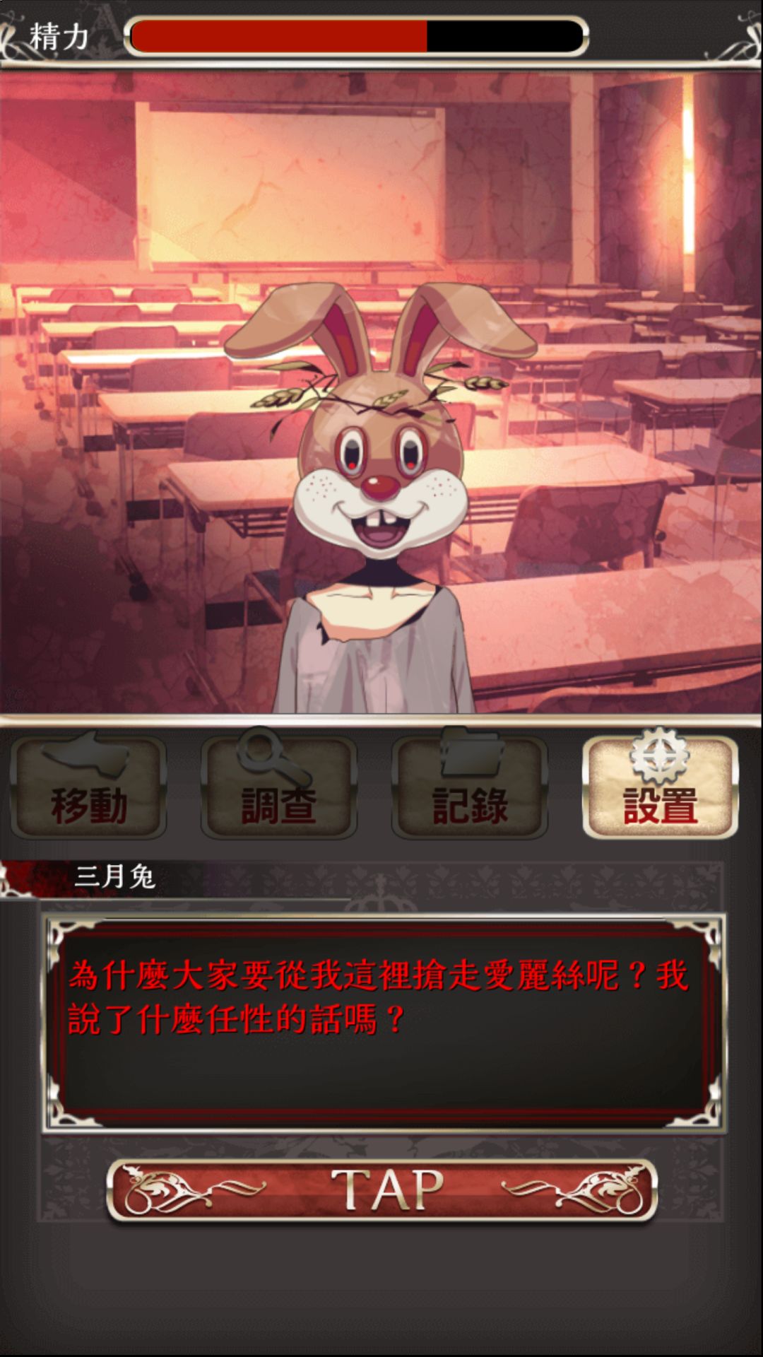 游戏开始就是爱丽丝一醒来发现自己什么都不记得了,从别人口中得知白兔在视听教室死了,红心女王因为之前霸凌过白兔所以被带去了精神审判庭进行审判,疯兔子决定先处决红心女王再判决,白莲花爱丽丝自然是不同意这样没证据就滥杀无辜的,于是开始了漫长的取证之路,这之间认识了毛虫老师、双胞胎,柴郡猫以及神出鬼没吓死人之三月兔(三月兔真吓人啊可)。