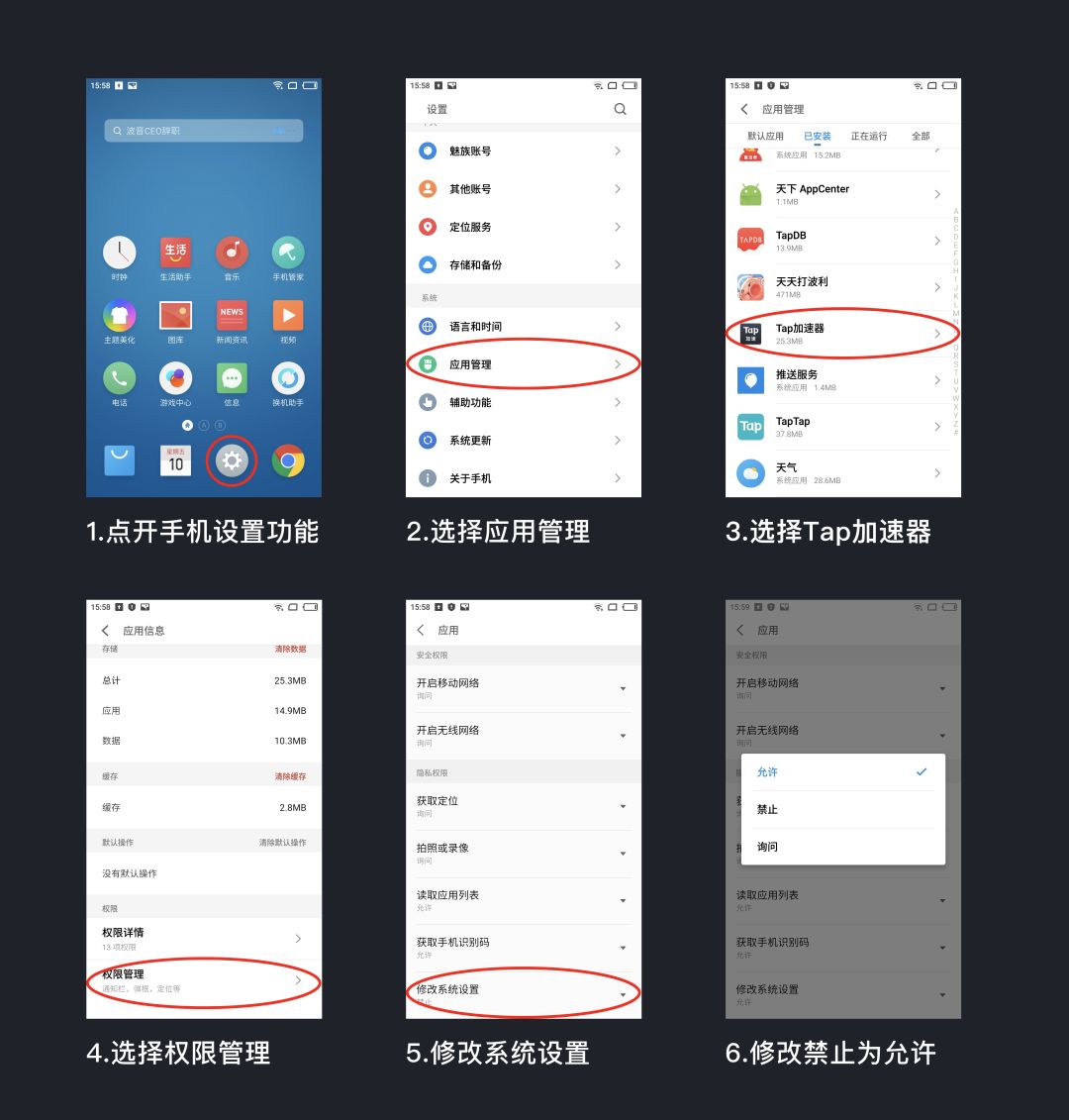 在更新了V1.3.0版本的Tap加速器后,许多玩家反馈在加速时遇到提示“权限不足”的情况,对于此类情况,大家可以打开手机设置-应用管理-“修改系统设置”这个选项,并设置为允许。