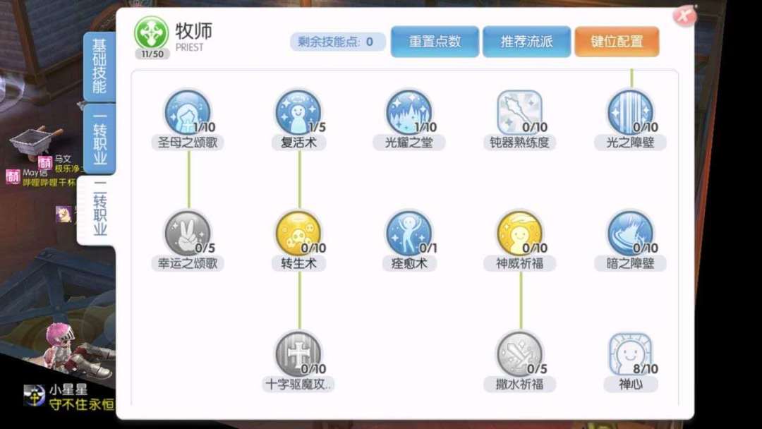 驱魔:作为一名驱魔师要的就是输出!哔哔哔哔!全智就好!!!技能点分配一转可以参考赞美,二转不点光耀、神威、撒水,把转生术和十字驱魔加满即可,其他加点依旧和赞美一样。但是3测得转生术那几率感人啊还有固定吟唱!十字驱魔想想就好!呵呵~~~