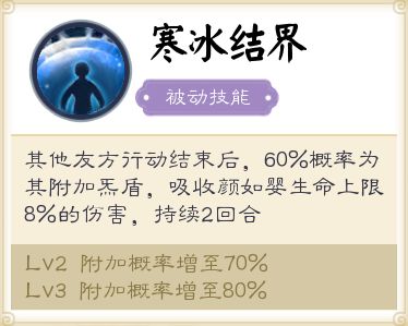 解读:类似于归海的回复,颜如婴无法给自己炁盾,且附加概率最高为80%。不同的是,颜如婴只能附加炁盾且时间为友方回合结束后附加。