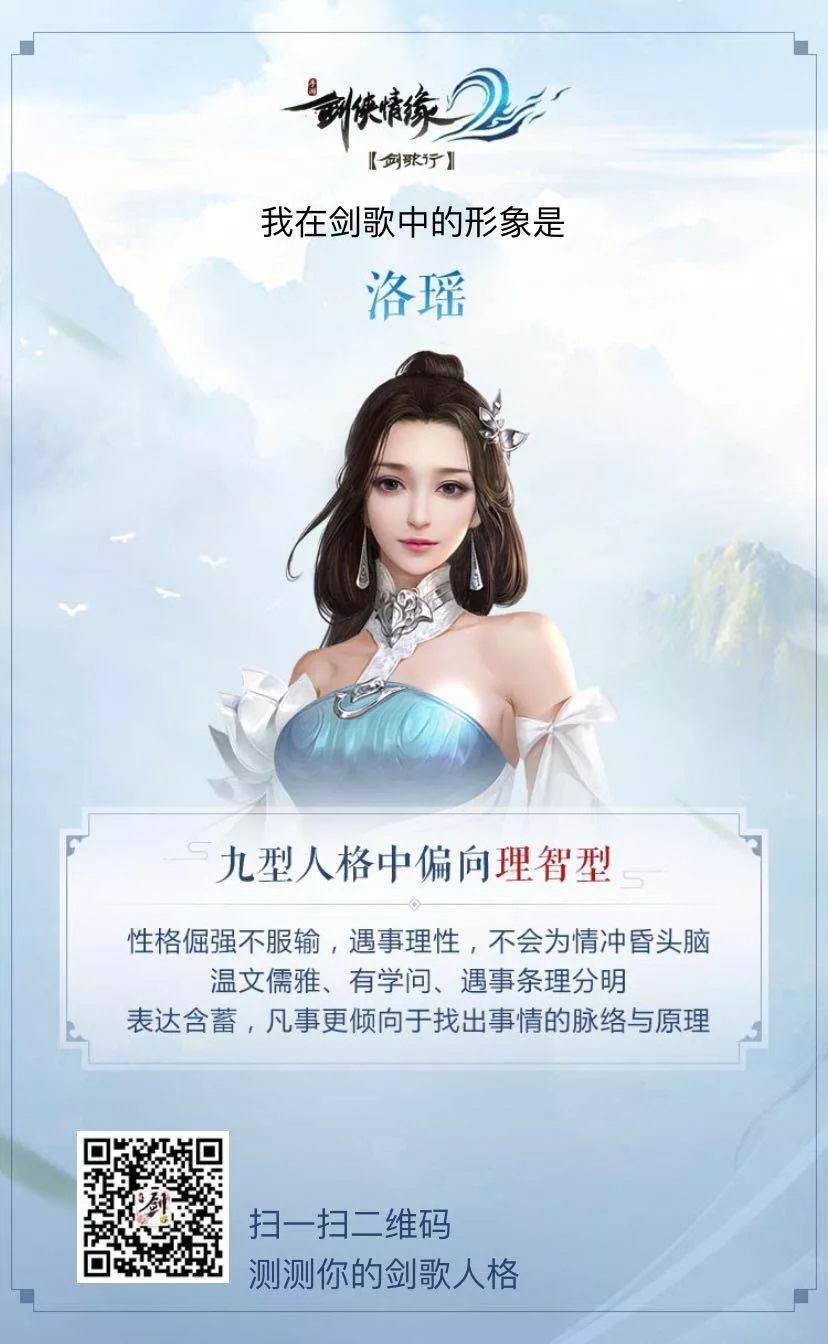 3.当完成人格测试题后,将会自动生成专属于少侠的人格分析,在这里少侠们可看到自己在剑歌江湖中的形象是谁哦~