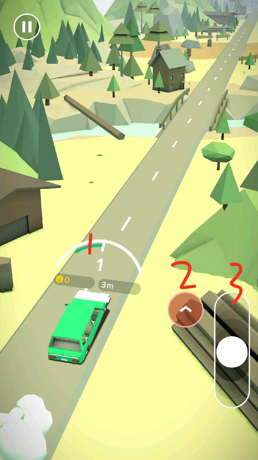 首先,滑动滑动条3,让汽车启动,当左边的绿色条1动的时候迅速按那个前角标图标2,就是滑动条3旁边那个,换档位,以后就只需要控制滑动条3就行了。感觉档位越高越省油,然后保持左边的条1在绿色区域部分。