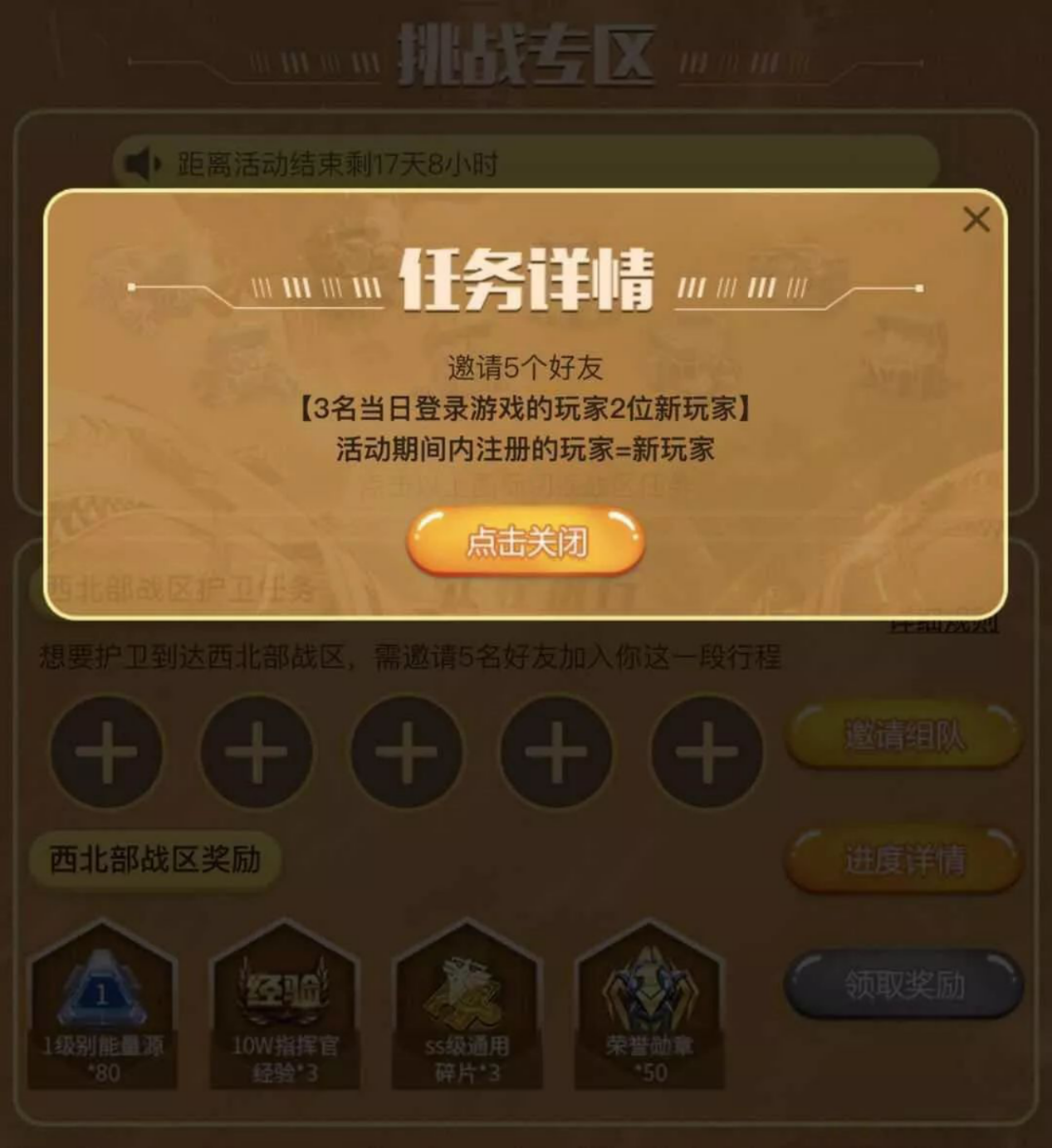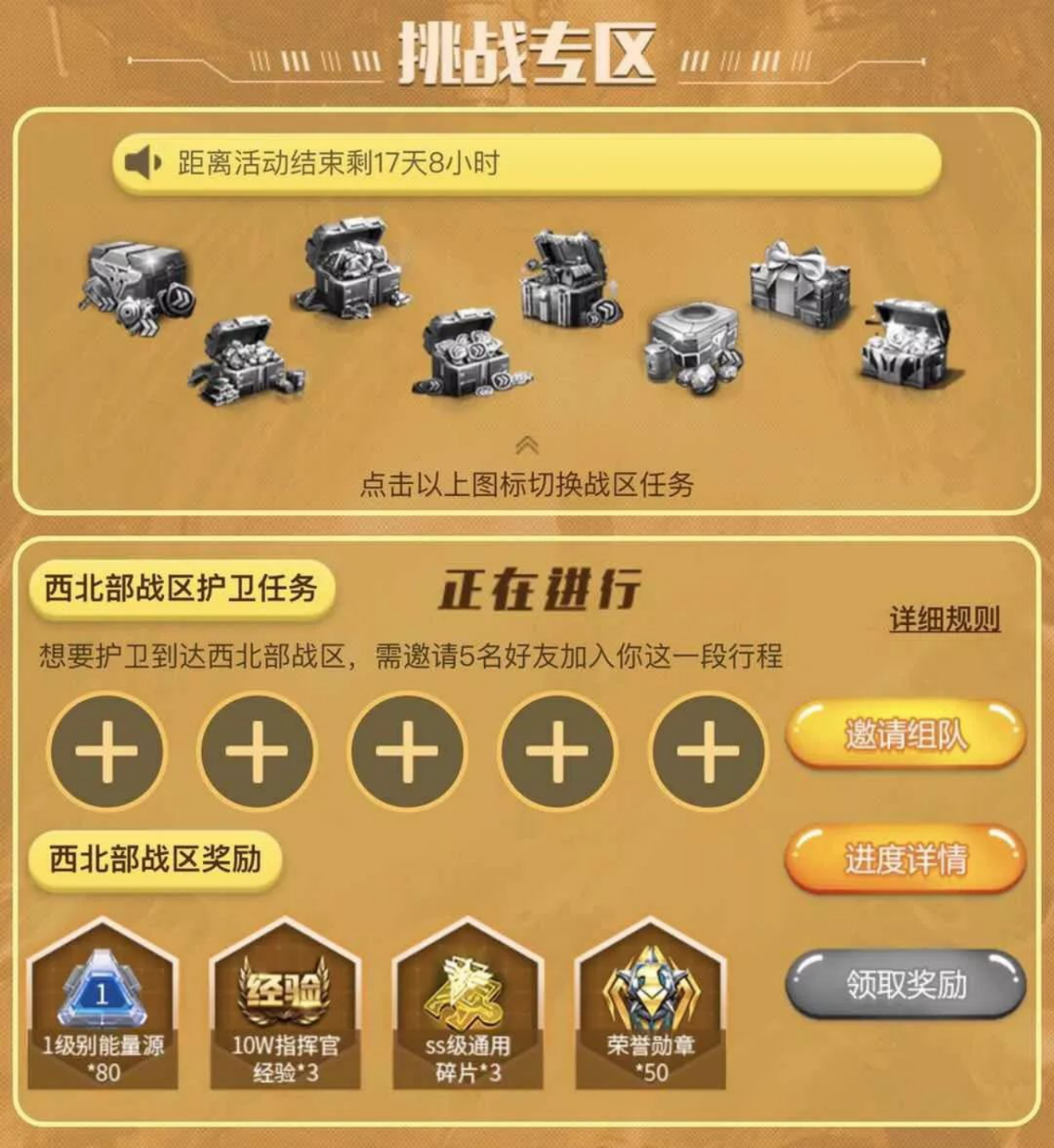 活动期间,一共有8个不同的任务,完成任务就可获得奖励,每个战区的任务详细要求,请在任务界面点击【详细规则】查看;