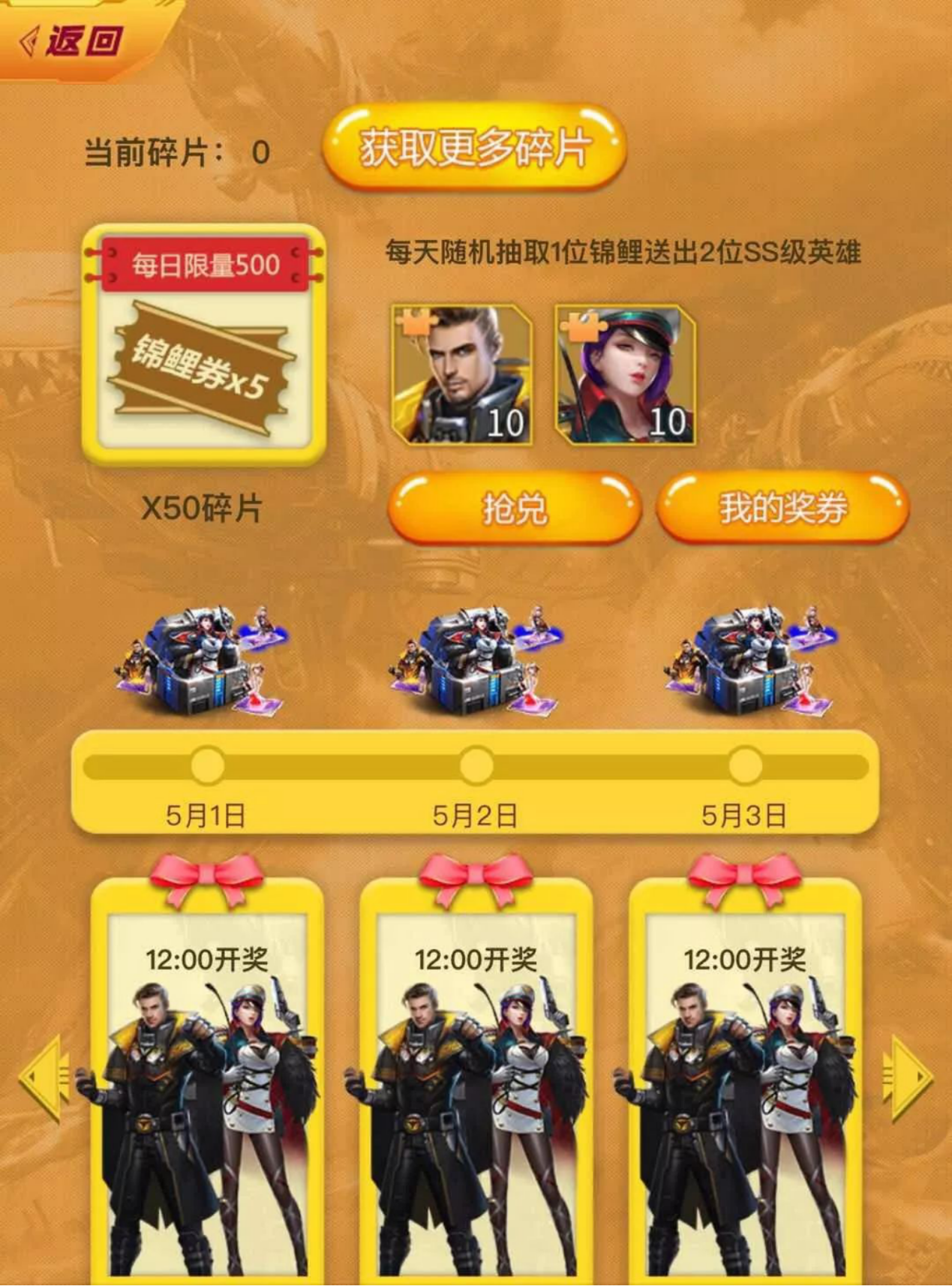 活动期间,每天中午12:00时会随机抽取一次幸运大奖,锦鲤券对应的玩家可获得SS级英雄喀秋莎和所罗门各一个!