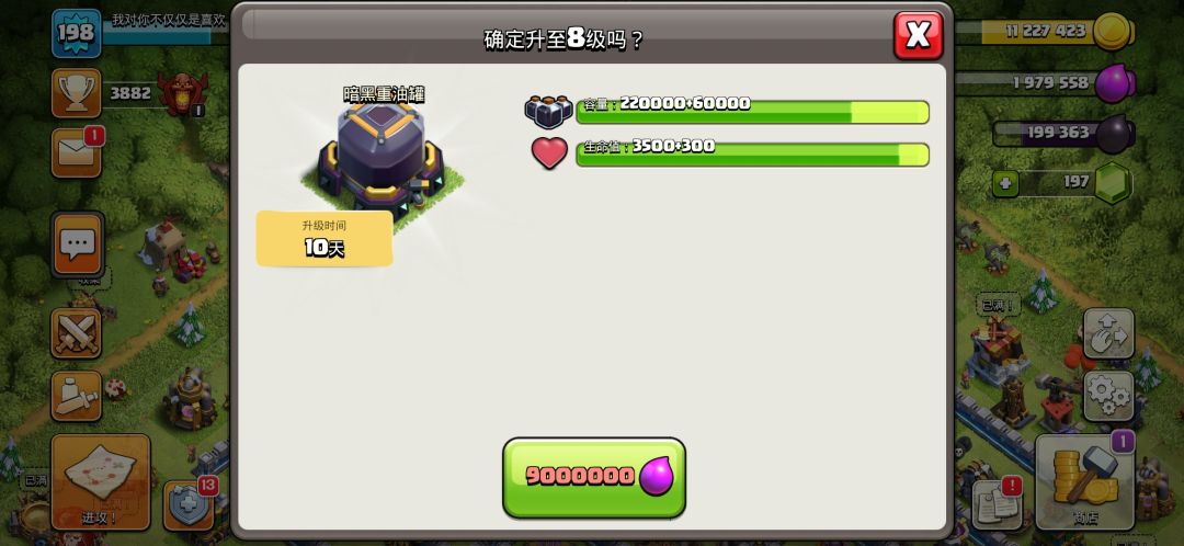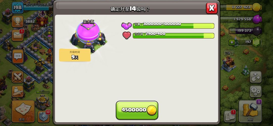 存钱存水可以各升两个(两个就够用了)。升兵种:看大家的爱好,低杯段打资源可以升地鼠,本人升气球(镜像雷龙狗球太猛了),镜像雷龙狗球下次介绍打法,以及强横在哪里。各兵种升到满级资源需求量。天使:1450w(15天)龙:1500w(16天)雷龙:1600w(16天)气球:1400w(16天)地鼠:1400w(15天12小时)野猪:28w黑油(16天)蓝胖:28w黑油(16天)治疗法术:1400w(16天)骷髅法术:25w黑油(15天)弹跳法术:1300w(15天)以上攻略是本人个人意见,希望大家多多评论,希望可以帮到大家。