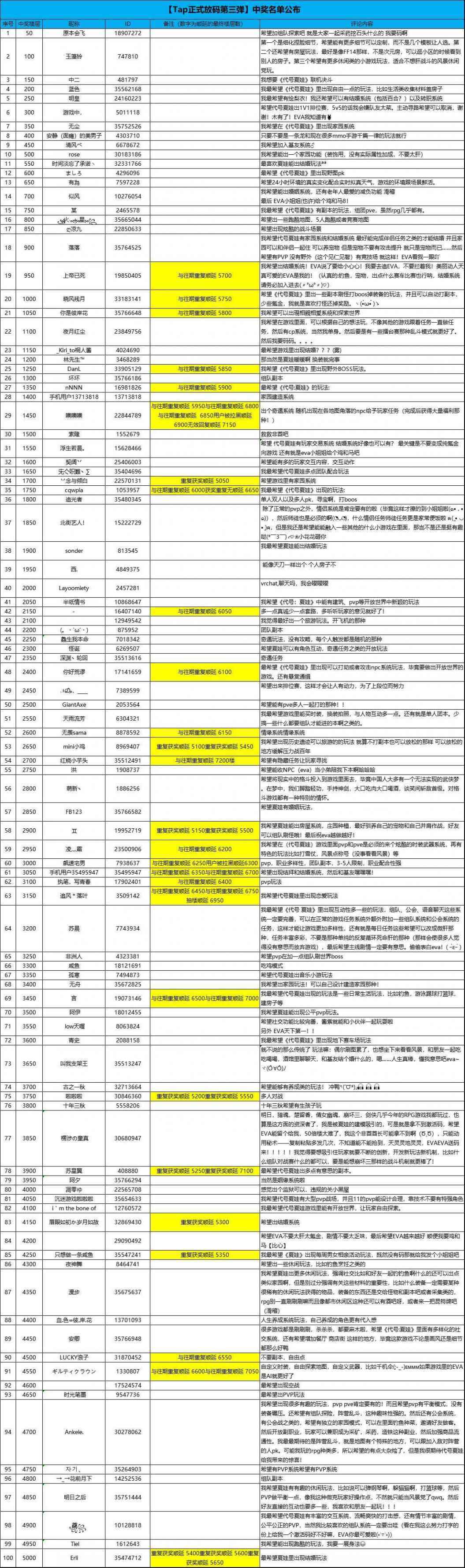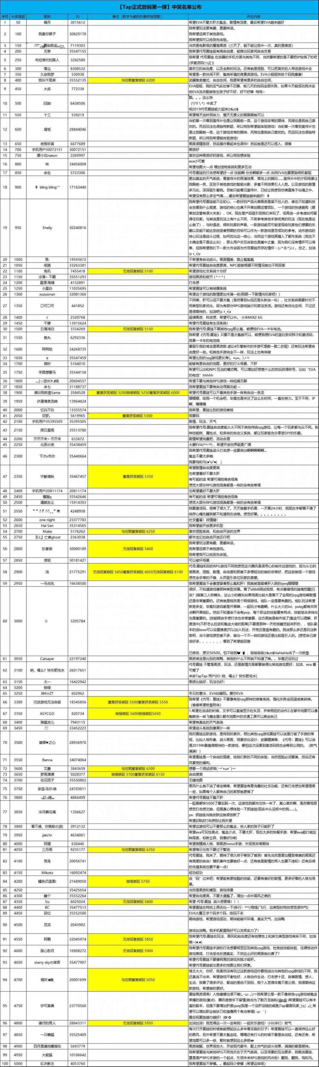 部分玩家的回复需要审核才能显示,以及大量玩家的回复被抽帖。导致EVA在统计名单的时候漏掉了这些人。为了维护公平,伸张正义,捞起欧皇!EVA对中奖名单进行了重新统计)EVA再一次维护了世界的和平(๑•̀ㅂ•́)و✧