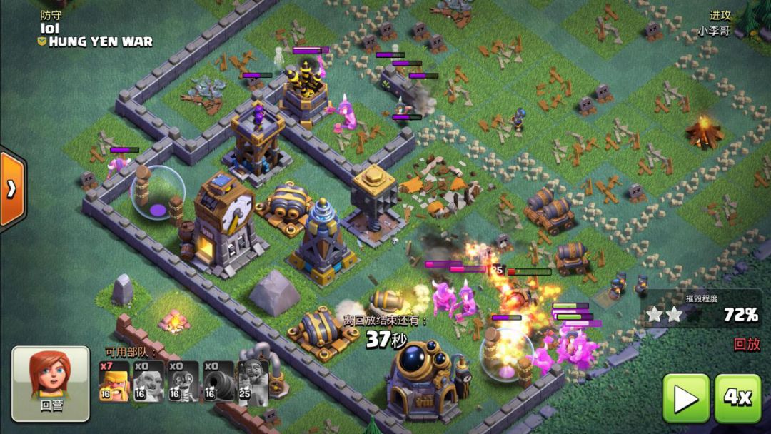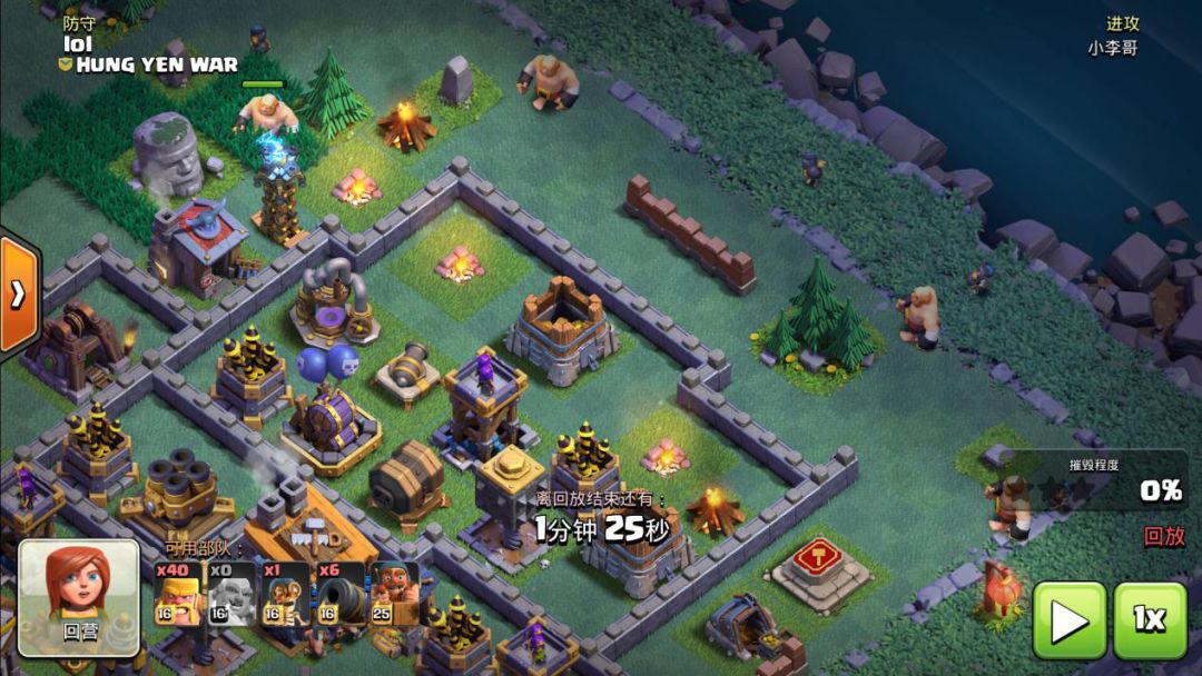 当我们第一波攻击结束后,即可沉底使用“王”,并且在各坦克部队后排使用“加农炮战车”推进。不过进攻中,加农炮战车可以对敌军防守强度较大的区域多使用一些(如撼地巨石)周围。随着不断地进攻推进,一旦对手克制性较大的AOE单位被切断后,即可打出人海狂暴野蛮人做二次推进,一方面爆发力足,另一方面还可以吸引对手很多单体防守设备的伤害,最终造成高额破坏。