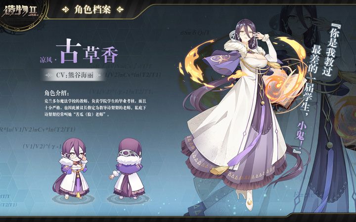 凉风·古草香是克兰多尔魔法学院的教师,负责学生的毕业考核,很少有人见到她穿着学院教师服以外的造型。对己对人都严格要求的她,也因此被议长指定为教导诗梨梨的老师。