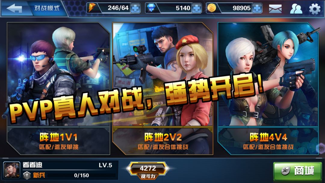 PVP真人对战模式,共分三种经典玩法:1V1、2V2、4V4三种玩法。