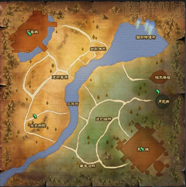 永昼城和永夜城中间相隔一条贝尔河,贝尔河之上有大陆上最大的瀑布——碧斯特瀑布。周围绿树成荫,只不过在靠近永夜城这边,因树木长期捡不到阳光,已经枯萎,让人感到神奇的是这些树虽然枯萎,但它们还活着,甚至脱离土地可以自主行动。