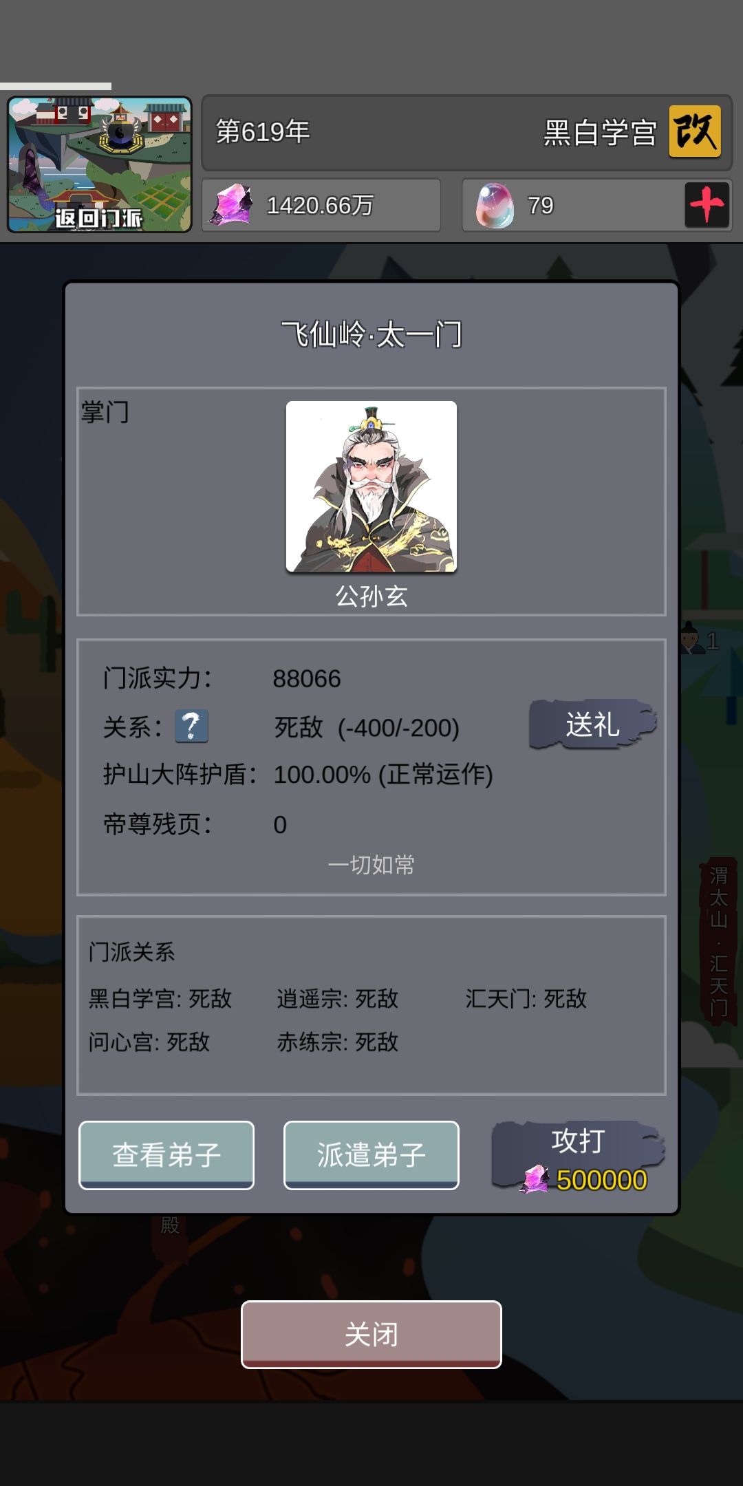 二,攻打其他门派,我看很多人都说打不过,确实,攻打其他门派很难,我是有了十几个道源境,战力比对面高了约有20000的时候去打门派的,打的同时一直给道源境用大还丹加血,最后勉强打过了,抢了那个门派的残页。然后我就放弃了攻打门派了,太费力了,而且不讨好,很多弟子都因为重伤然后忠诚度下降了,还得给他们回上来。