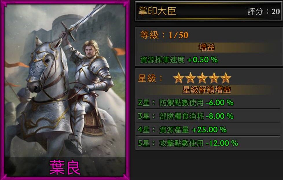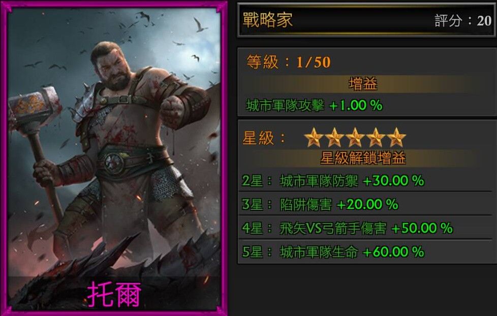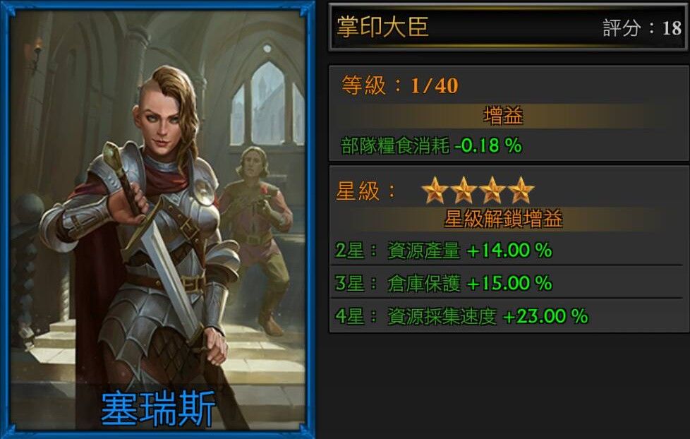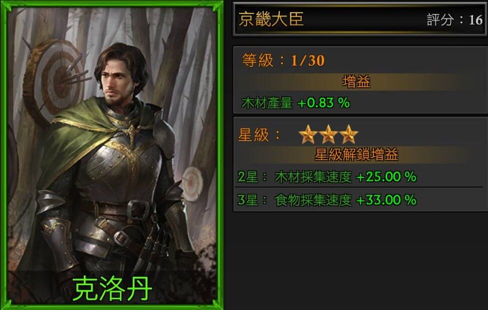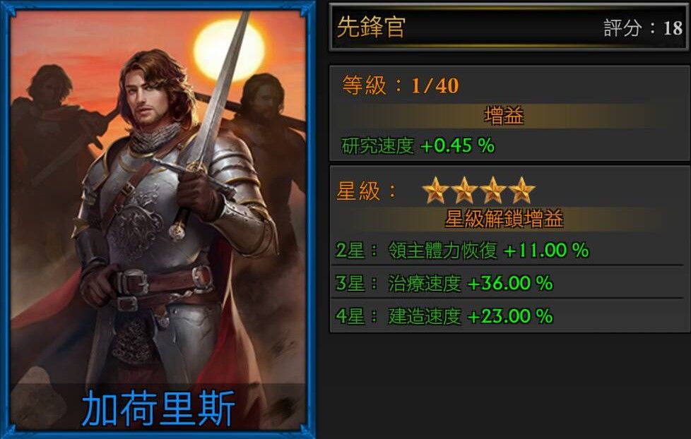 其实就所有英雄来说,小弟最想赶快升满的就是这隻。 一星增加研究速度不说,四星是建造速度。都是很需要的加成。 最重要的是! 二星有领主体力 11% (而且提升二星的等级之后还会往上加) 这是一隻非常非常非常值得培养的英雄。(因為很重要所以说叁次)