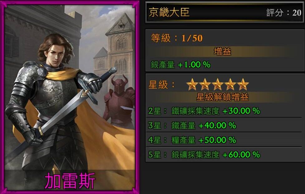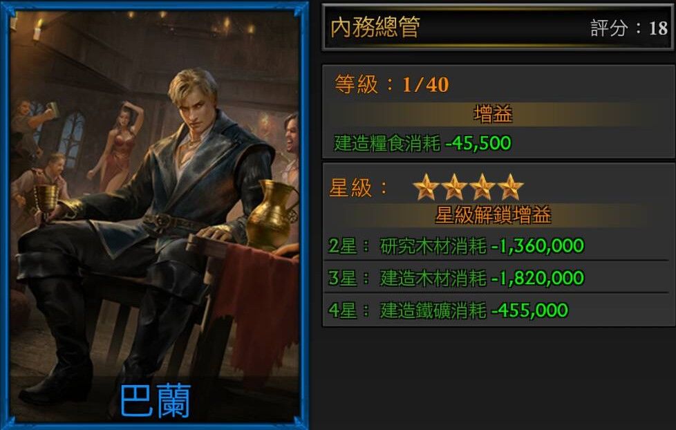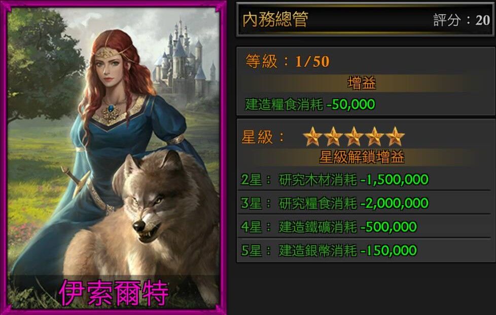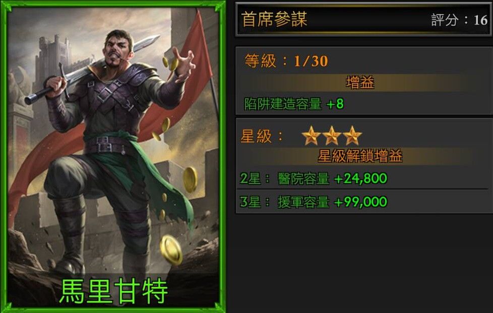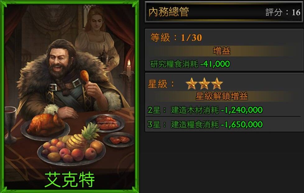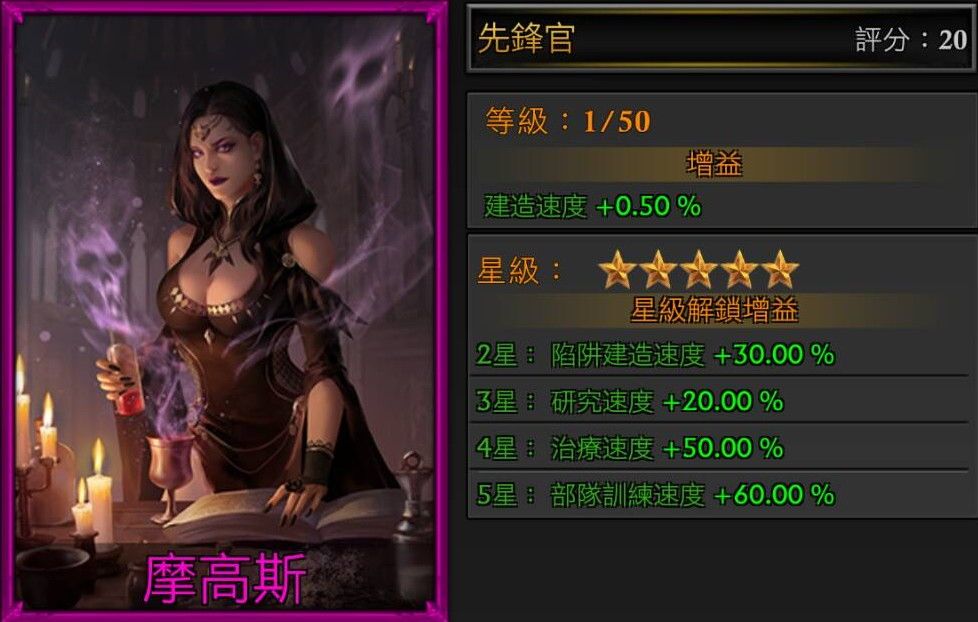 其实就所有英雄来说,小弟最想赶快升满的就是这隻。 一星增加研究速度不说,四星是建造速度。都是很需要的加成。 最重要的是! 二星有领主体力 11% (而且提升二星的等级之后还会往上加) 这是一隻非常非常非常值得培养的英雄。(因為很重要所以说叁次)