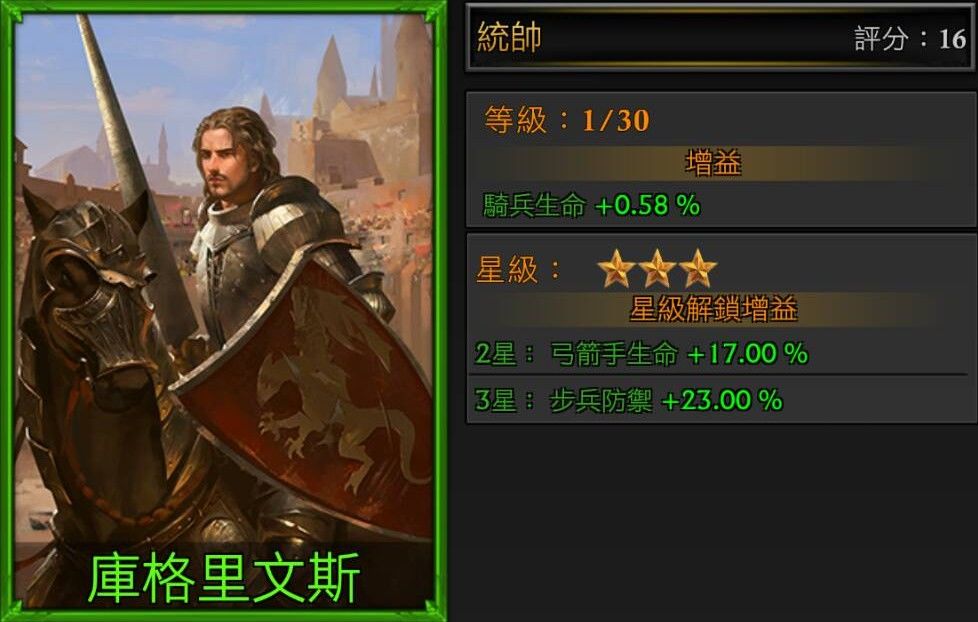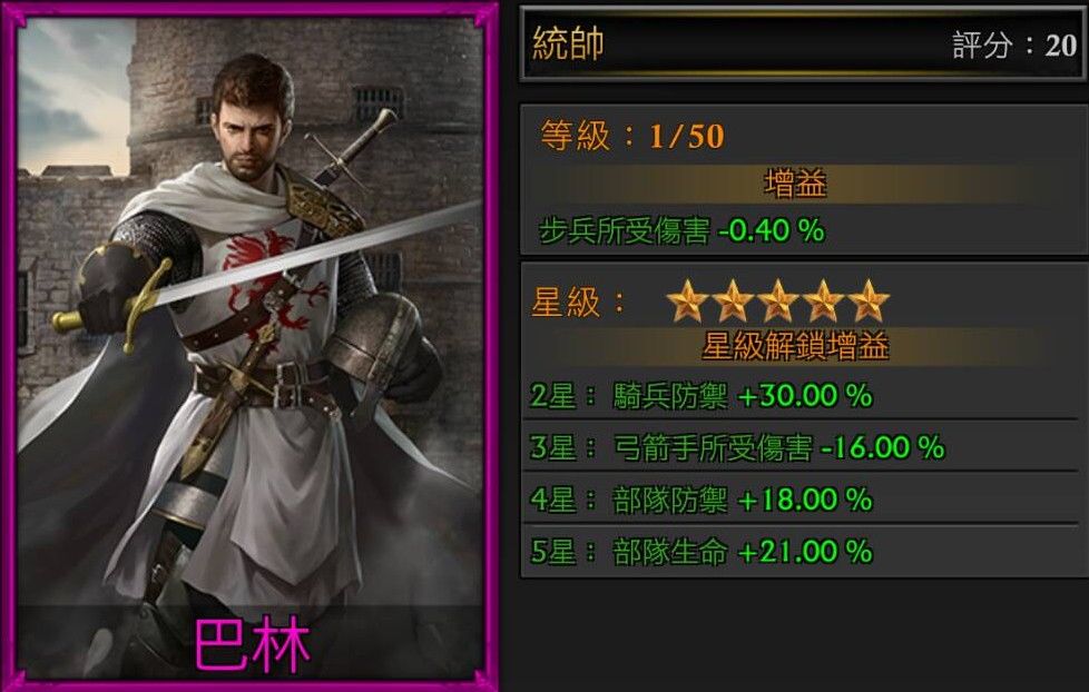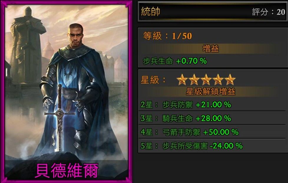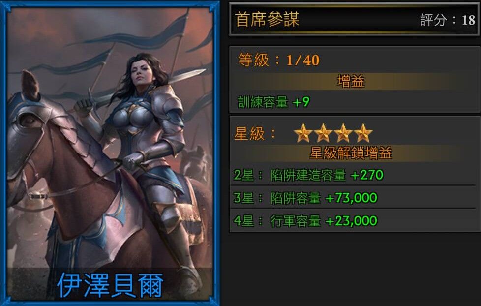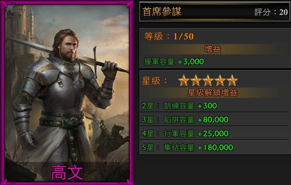 叁星有着很强大的步兵防御加成,四星也有着很强大的部队生命加成。 这是一隻非常值得培养的英雄。但相较绿英,成型时间跟门槛相对提高。