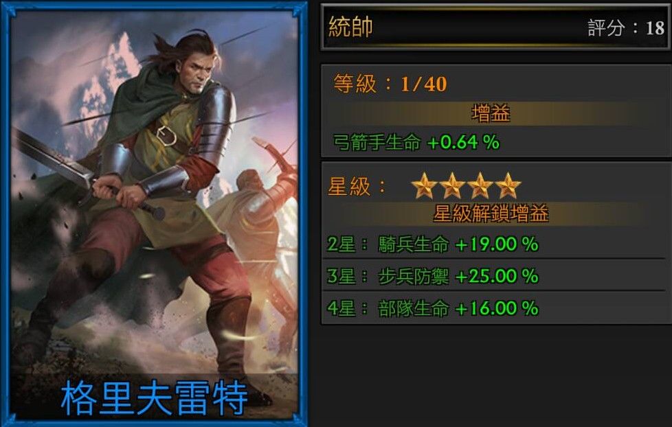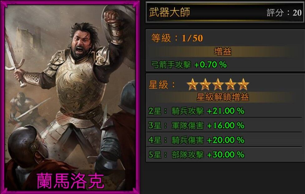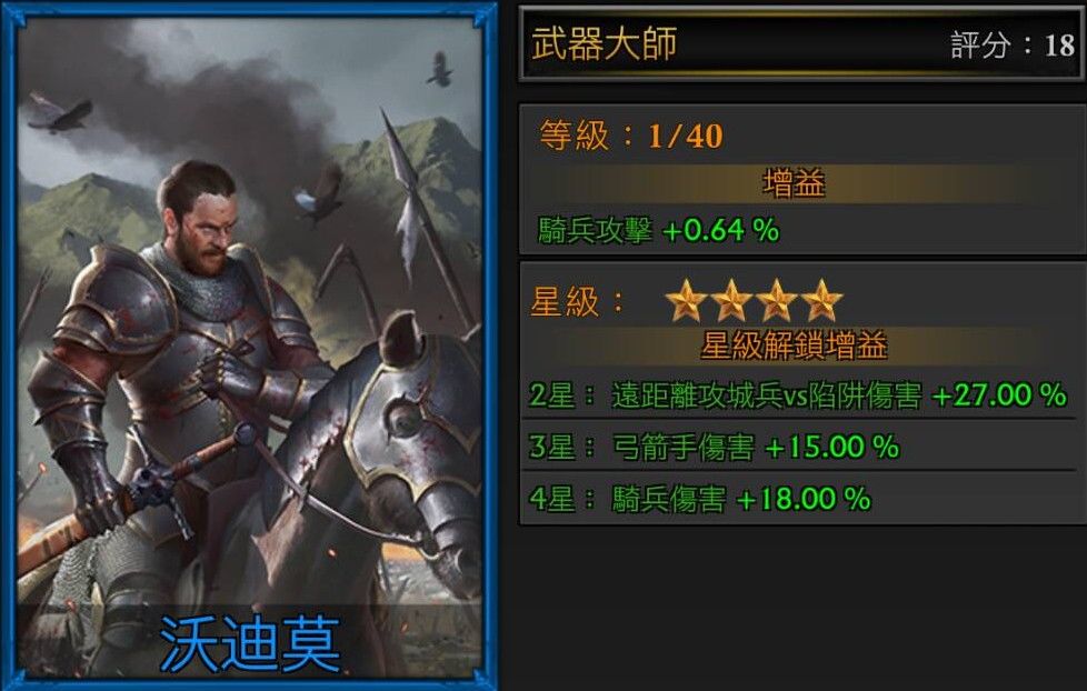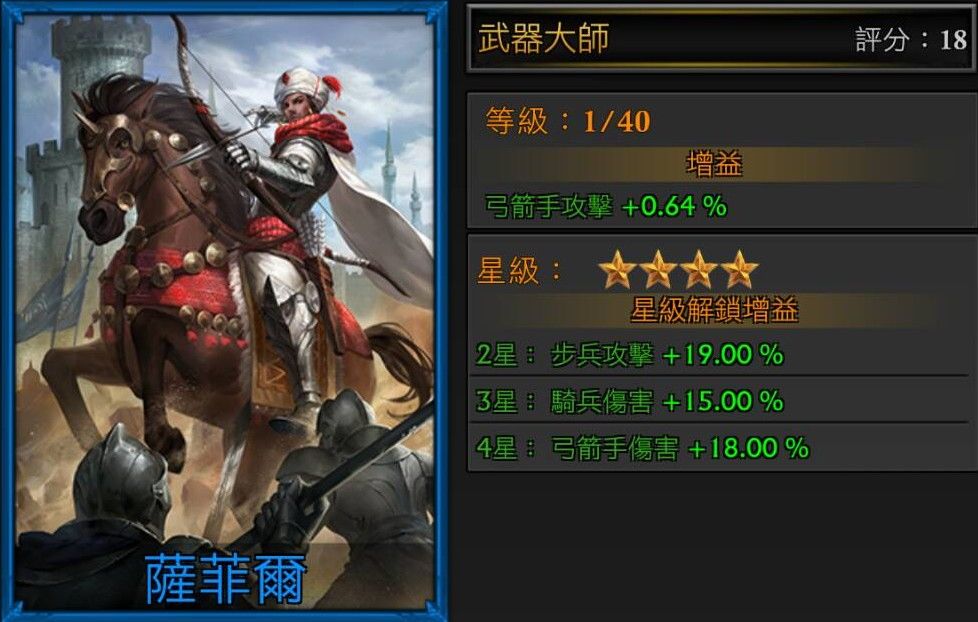 一星就有骑兵攻击加成,且二、叁、四星都是针对攻击相关的加成提升。 这是一隻非常非常值得培养的英雄。