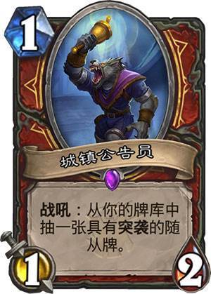 我们的卡组中共有3张突袭随从,城镇公告员可以稳定检索1张,让卡组更流畅,值得一带。