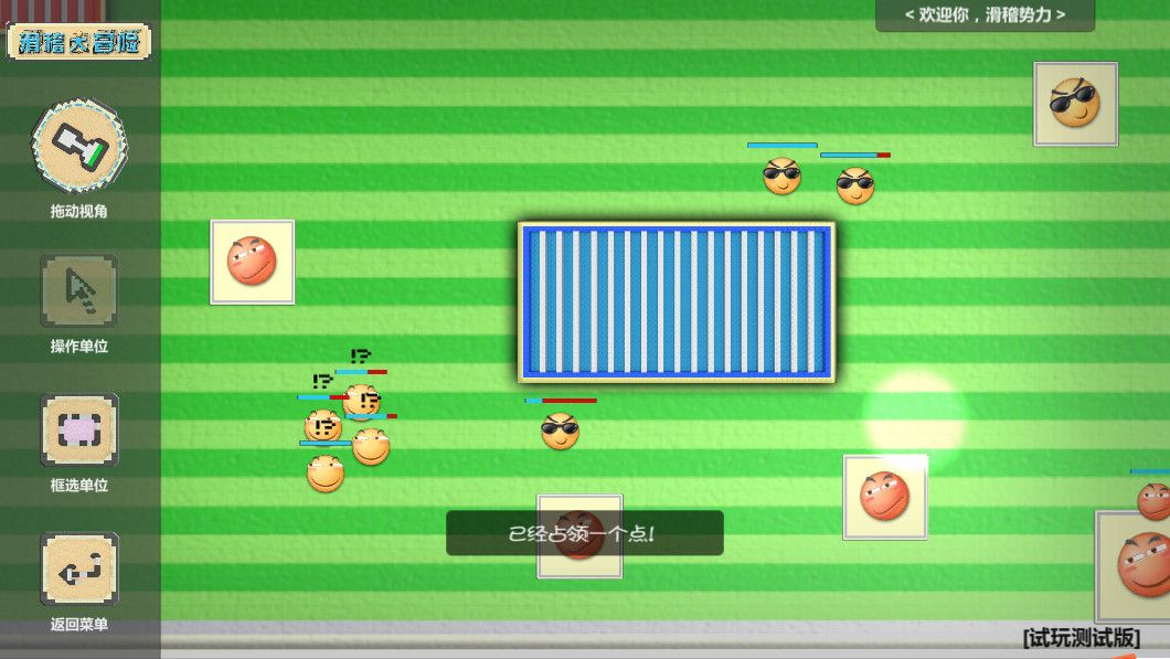 进入游戏后,首先要知道游戏的目标:“游戏四个边角共有四个复活点(大方块),期间还有许多的占领点(小方块),势力进入占领区(包括复活点)一定时间内没有受伤则自动进行占领,小方块据点占领后会增加重生速度,大方块则是游戏的最终目标,占领一个势力的大方块后,被占领势力则游戏结束,玩家的目的则是不被其他势力占领并占领其他三个势力(大方块),在新版本(V1.0.1)中获得胜利还会奖励20~40的滑稽币”