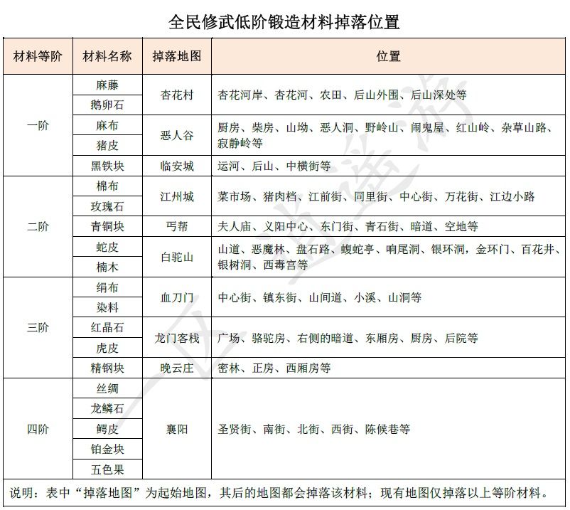 全民修武低阶锻造材料掉落位置