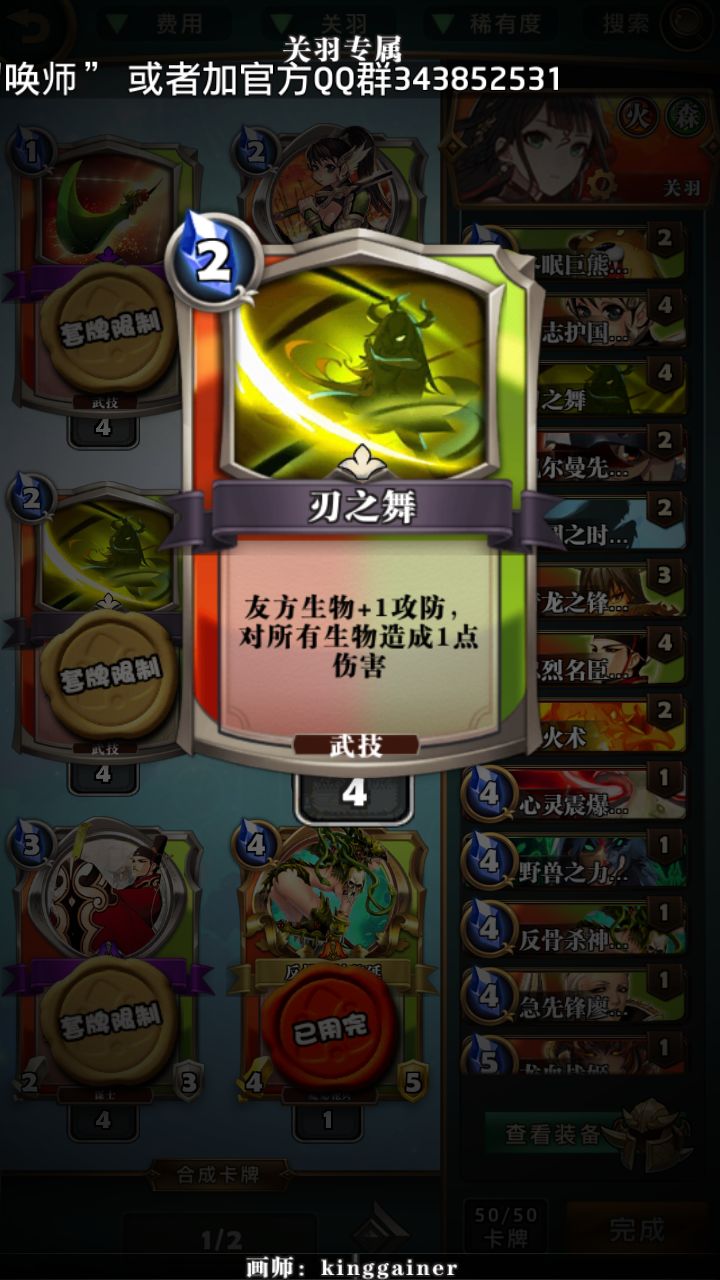 在护国军两三个的情况下或对面有丝血的情况下可以用刃之舞进行强化和补刀。在没有护国军的情况下就要用丞相来召唤护国军。缺点:如果两个都没有那就只能看你的卡牌来选择进攻或者防守。