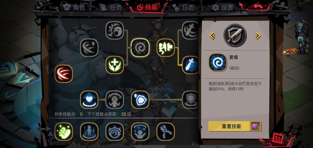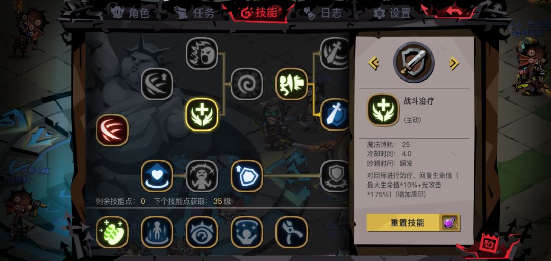 专为其它职业打造的剑盾被动技能,能够有效防止面对物理怪时暴死,其它职业必点技能,但是鉴于战斗治疗的亮眼表现,并不推荐加点。(英雄本不点战斗治疗的剑盾谁要……)