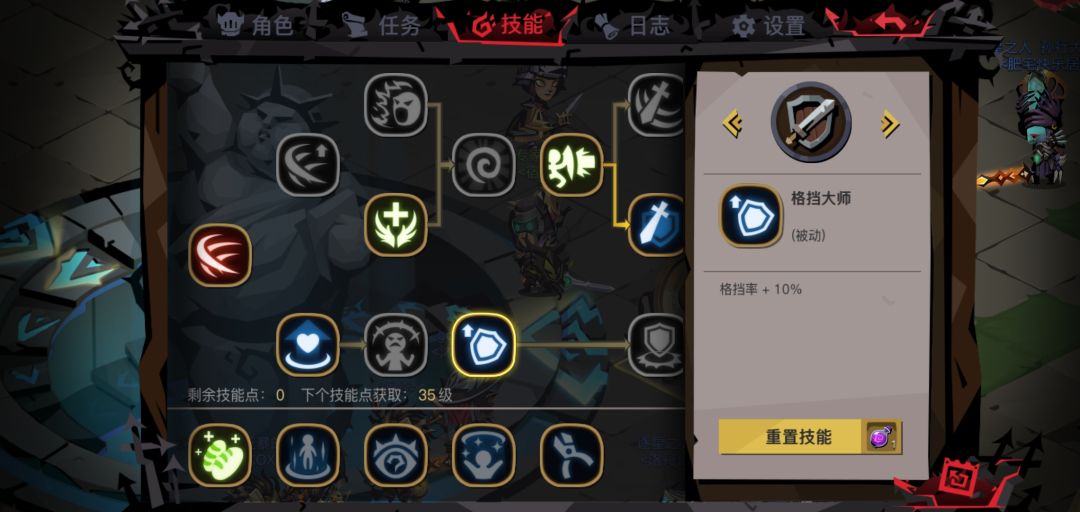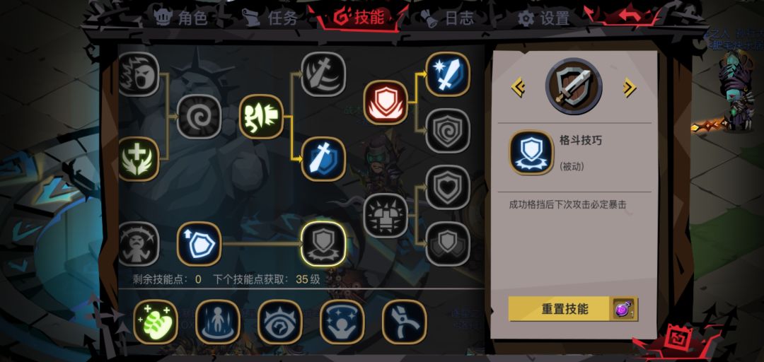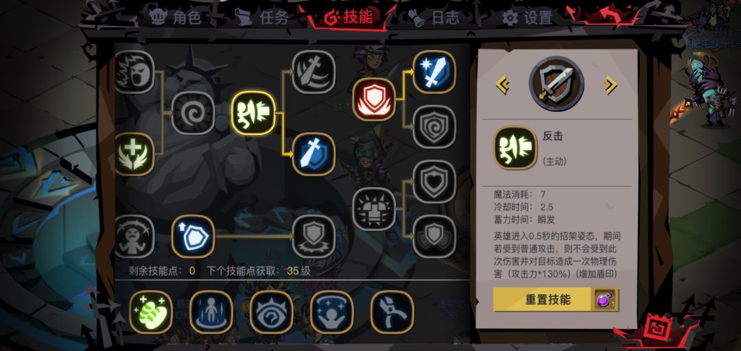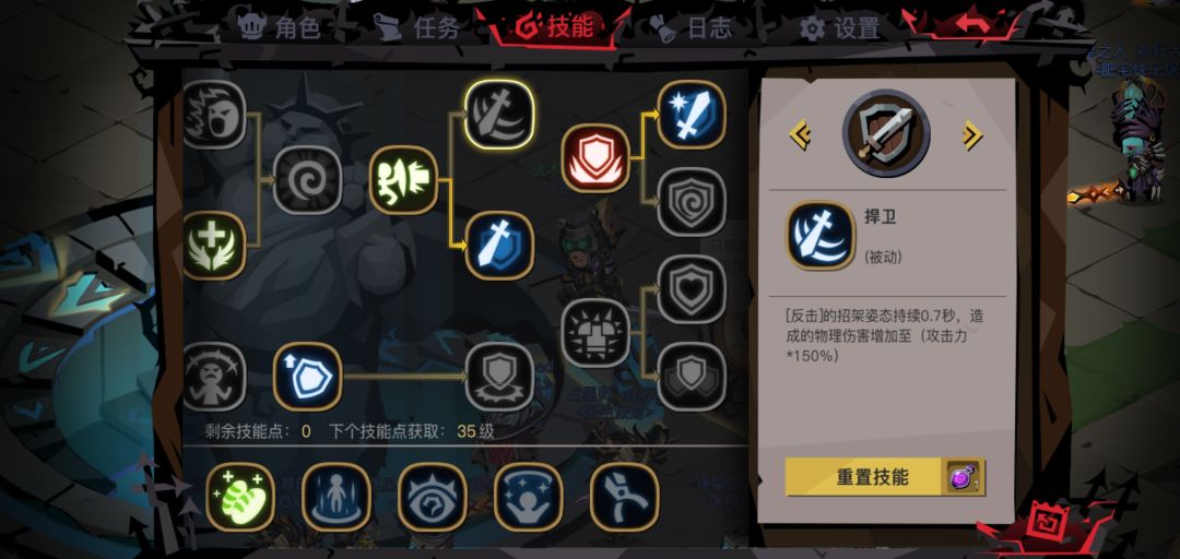 在上面已经详细写了反击的判定机制,因而可以得知,反击并不是为了打输出,伤害加成没啥用,并且招架时间太久反而起到反作用,无端增加技能后摇,不要说鸡肋了,这个技能有毒,不建议加点。(点了剑盾就没盾了,没有灵魂)