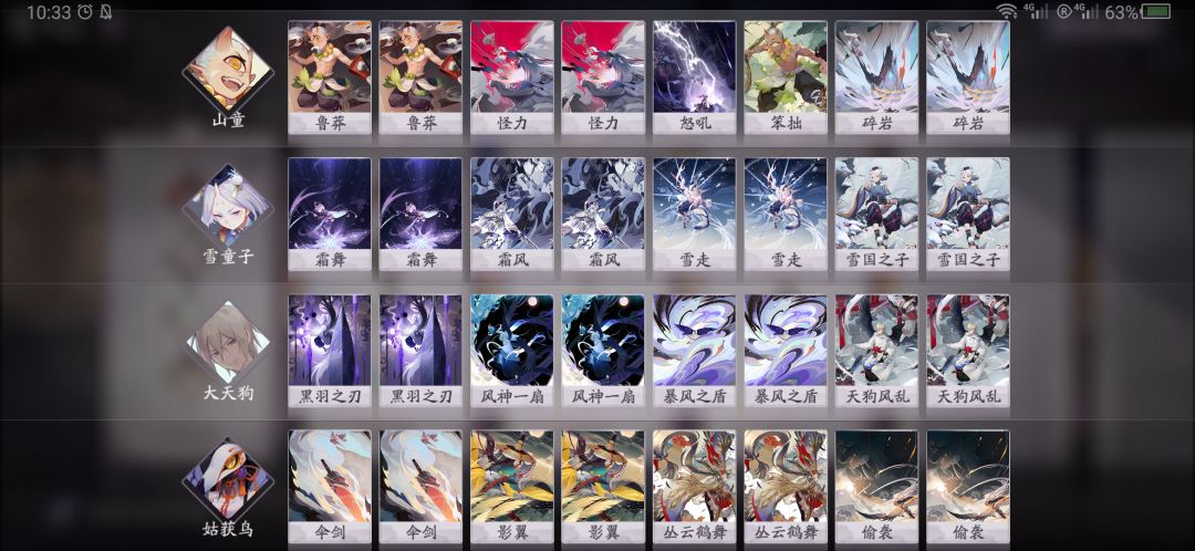 阵容名: 山童 笨拙 (1) 碎岩 (2) 鲁莽 (2) 怪力 (2) 怒吼 (1) 雪童子 雪走 (2) 霜舞 (2) 雪国之子 (2) 霜风 (2) 大天狗 风神一扇 (2) 天狗风乱 (2) 暴风之盾 (2) 黑羽之刃 (2) 姑获鸟 偷袭 (2) 伞剑 (2) 影翼 (2) 丛云鹤舞 (2) 阵容码:MTAxXzQ2MzM0MDZfMTU3OTk1NTQ4NHx6eMYSyhLOEt4SYRRmFFYUWhRdFC4OFg4aDh4O4gfeB9YH9gc= 如果想要使用此阵容,可将阵容码复制到剪贴板,然后在“新建阵容”里点击“使用阵容码”进行粘贴。