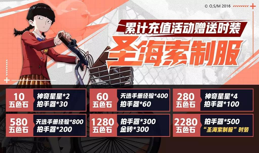 累计充值 2280五色石 “圣海索校服”时装和拍手器*500
