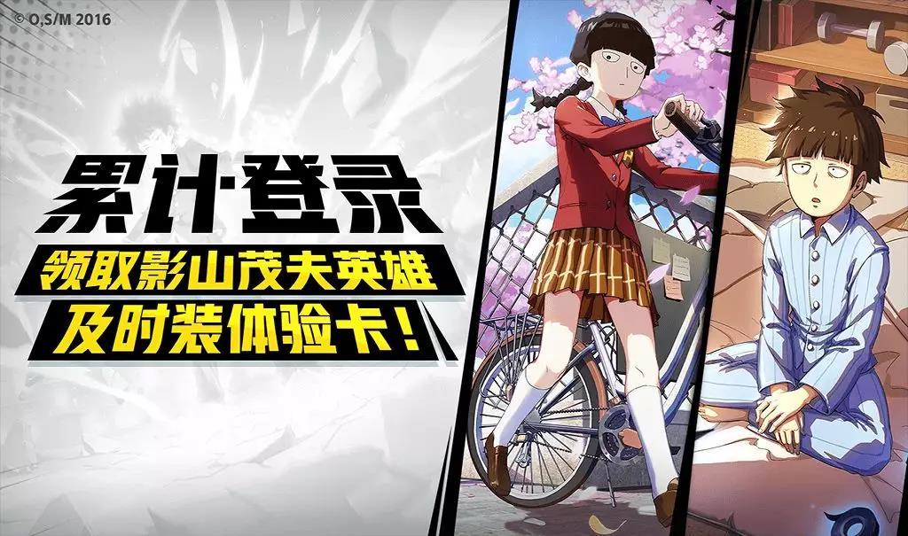 活动期间,登录即有好礼相送!登录1日即可获得英雄影山茂夫3日体验卡,累计登录2、3日分别可获得影山茂夫时装“家居服”、“圣海索制服”1日体验卡,累计登录4日还可获得限定回城特效“超能拜拜”体验卡!