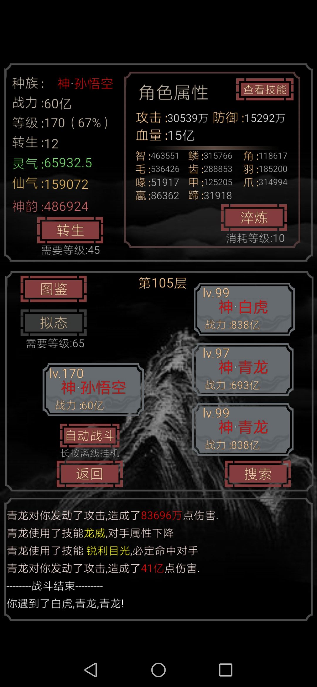 第二次通关主要技能 学习 变化 通晓 光芒 魅惑 不死 九命 河蟹(一刀999) 真龙血脉 锐利目光 扶摇直上 暴怒 战意拟态问题十转后战力基本在2000万左右史莱姆-在1到4层刷凡人 10级史莱姆直接变凡人就可以直接挂机1小时。可以看拟态,成功率在百分之五十以下的不用看了,如果没有你想要的,就打到25层左右开始淬炼 淬炼时候注意战力尽量能打得过25级,看看拟态有没有大罗金仙,没有的话可以重复挂机的过程,在淬炼。有大罗金仙出现,但是没有boss形态,这个时候你就要打神韵了,前标带神字的,神韵超过仙韵就会出现boss形态,多打一些成功率会高!没通关的可以选大罗金仙(人形态技能空位多)有想拟boss形态的话就必须是类人类或者人形的才可以boss形态,就需要通关完领了图鉴才可以拟态。如果没有可以转生重复上面步骤!
